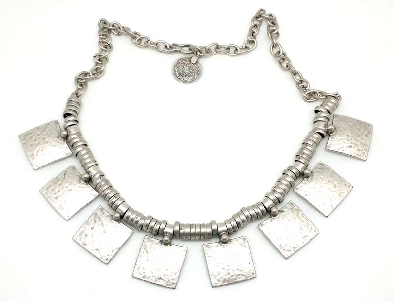 It is silver-plated over Zinc. It doesn't change colour. Led and nickel free.