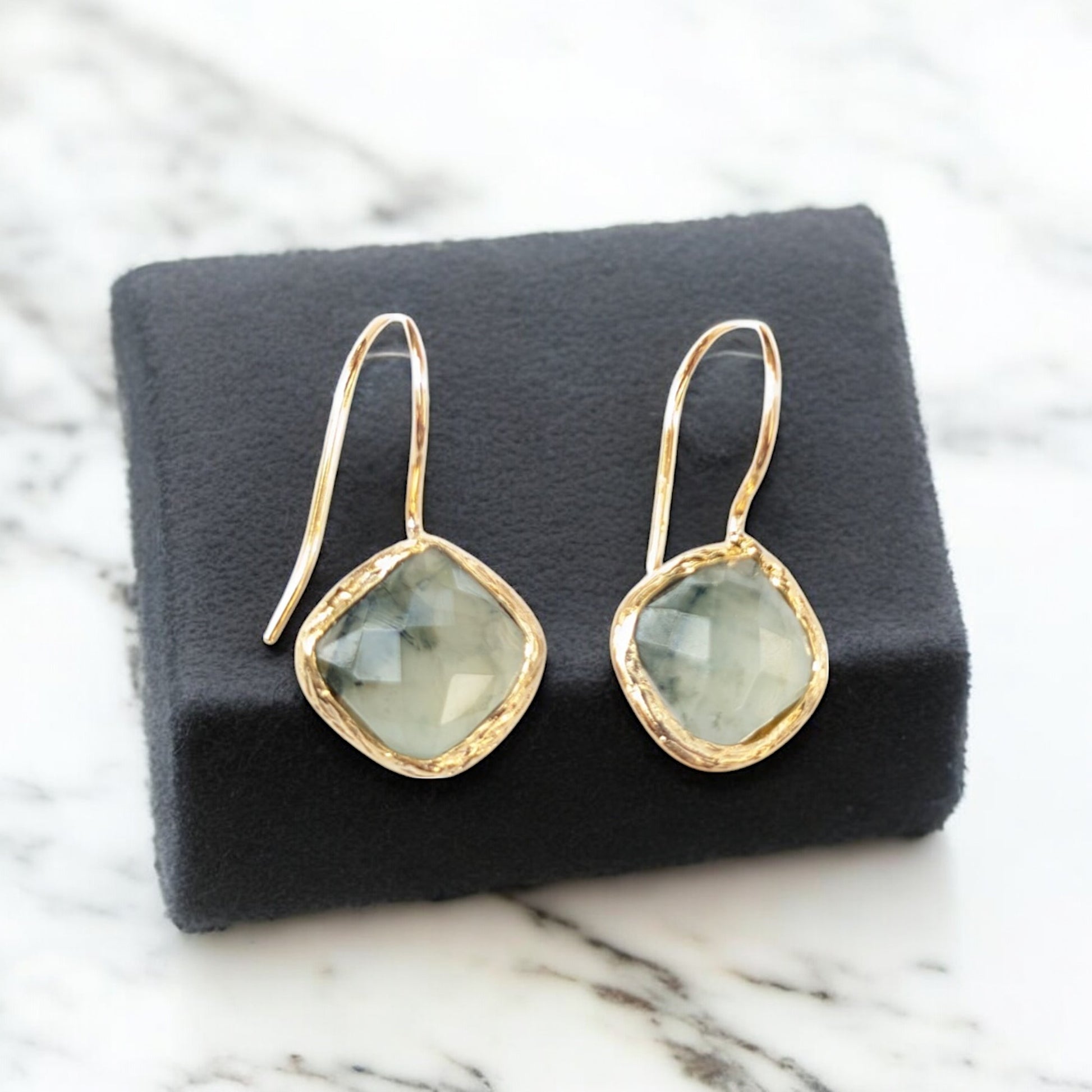 Add a touch of natural beauty to your jewelry collection with our Aventurine Drop Earrings. Each earring features a light greenish-blue aventurine stone in a teardrop shape, set in a textured gold bezel and suspended from a simple gold hook. The aventurine stones, known for their calming hues and shimmering inclusions, symbolize courage, self-expression, and inner peace.