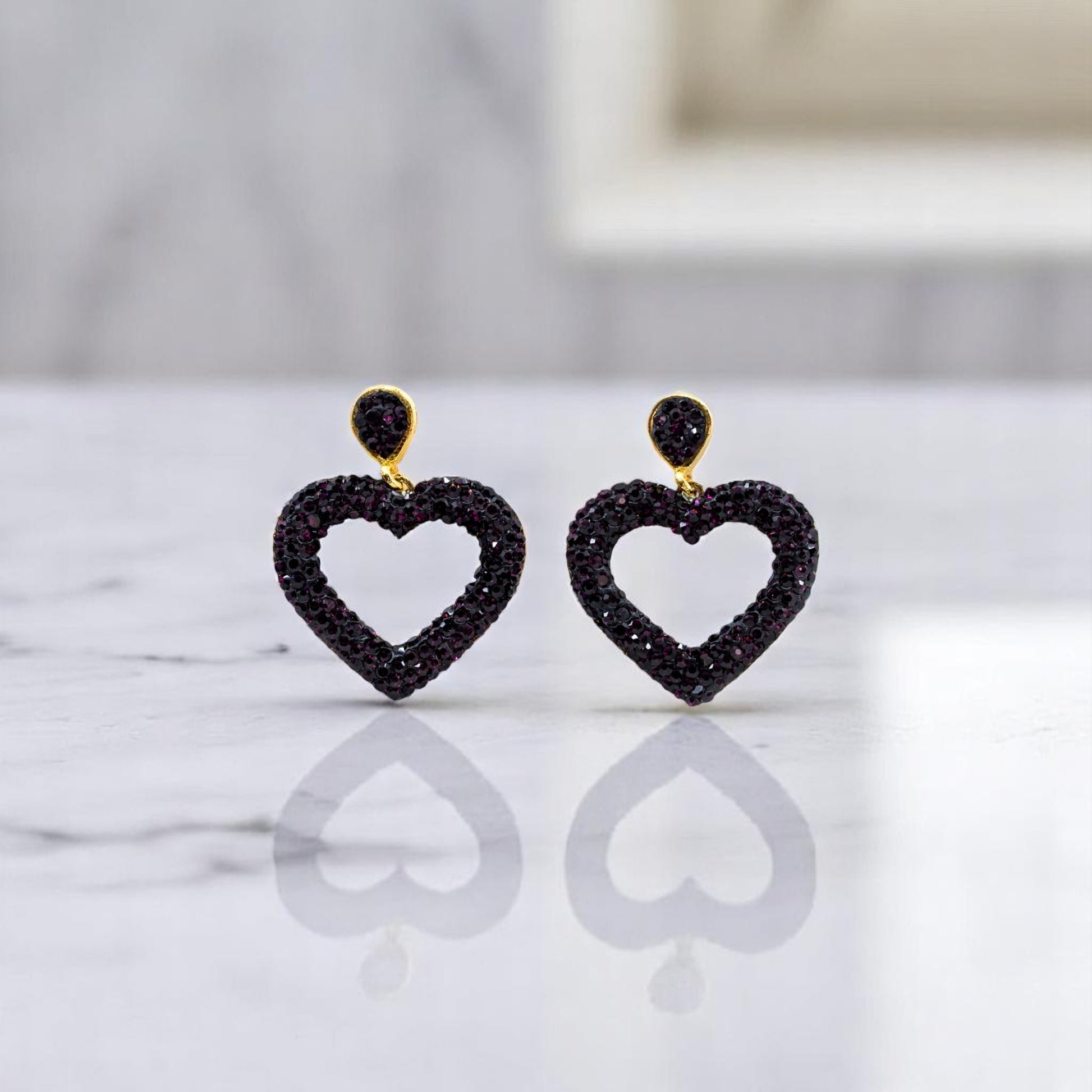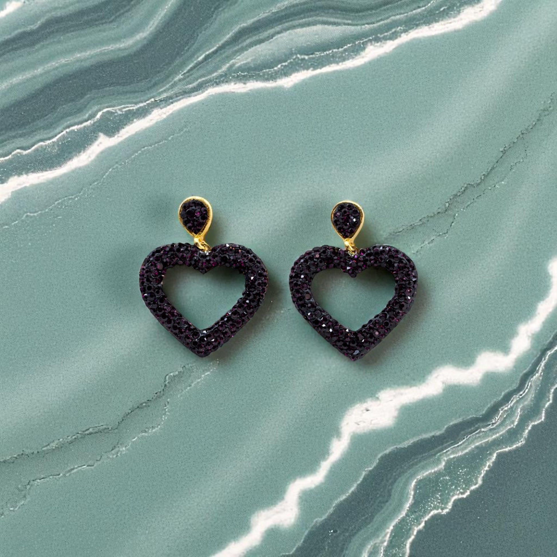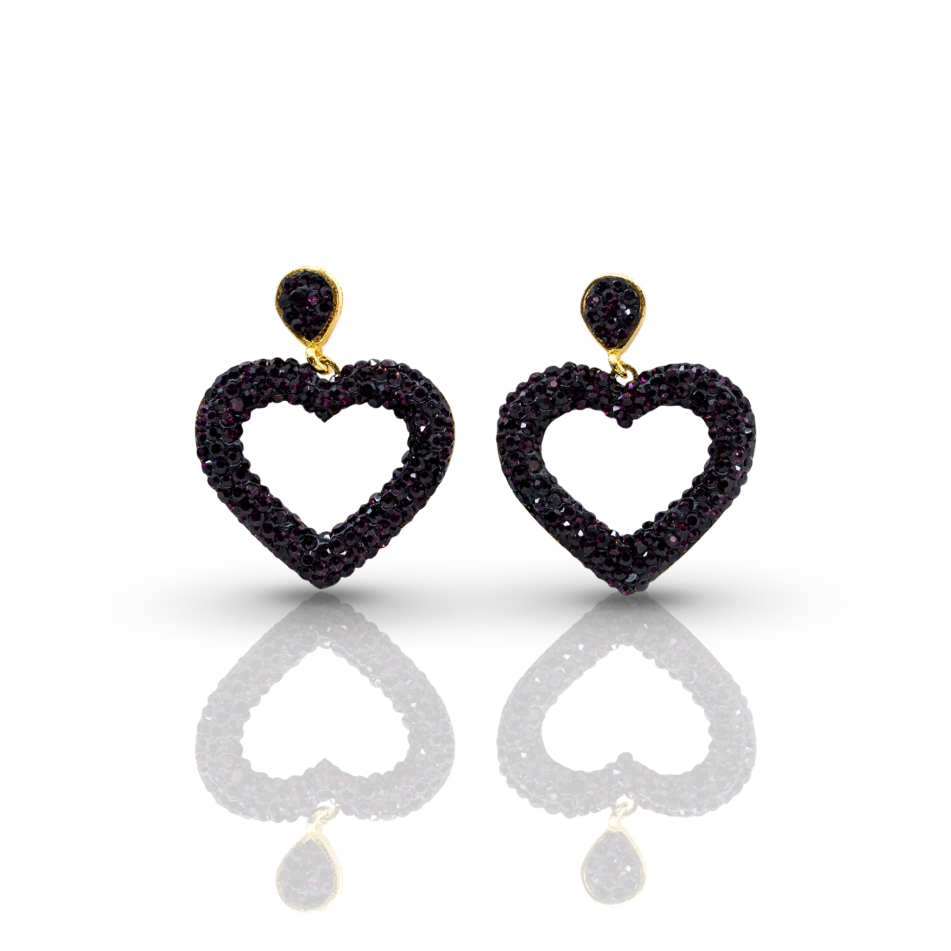 Open hearts dangle down on purple sparkle gold earrings.