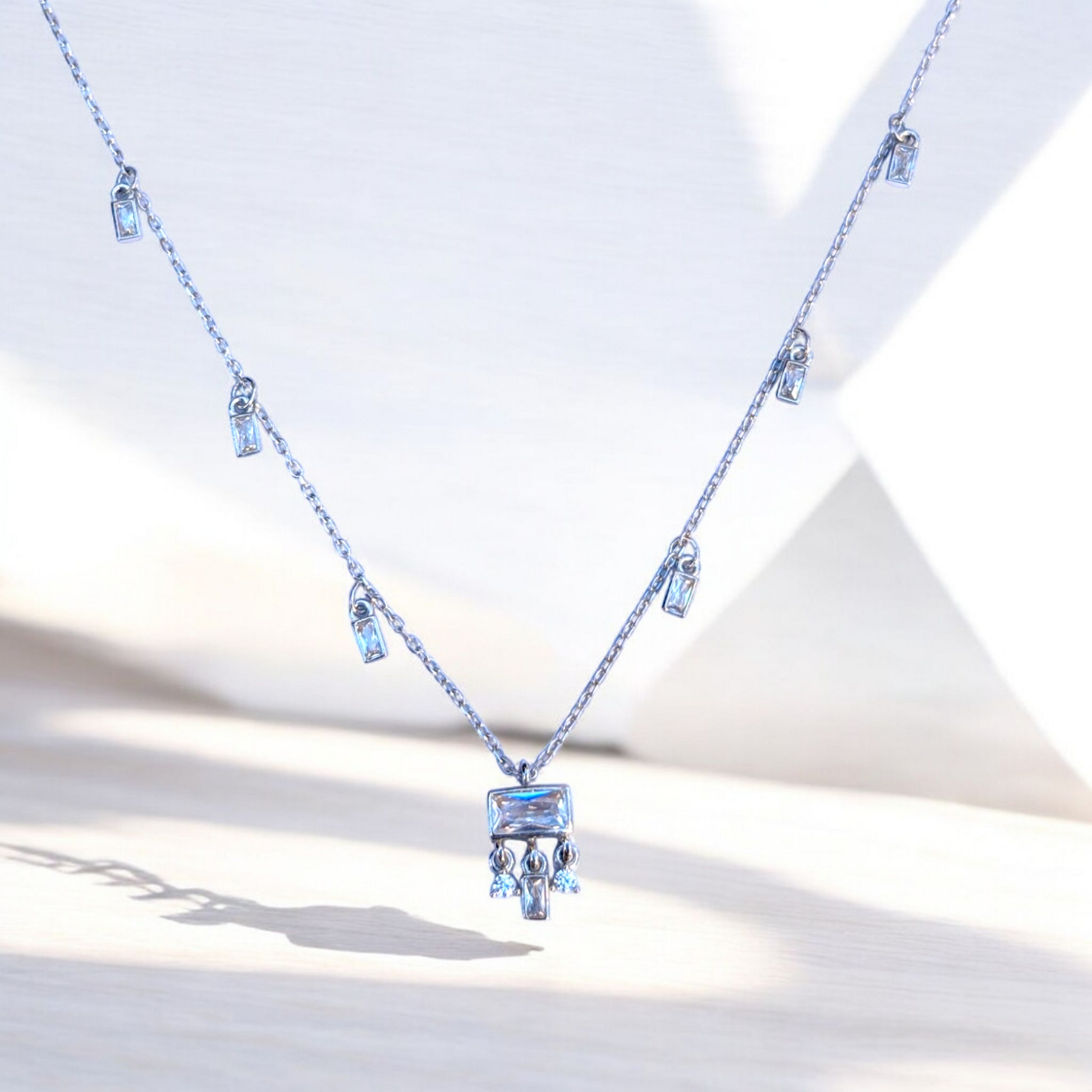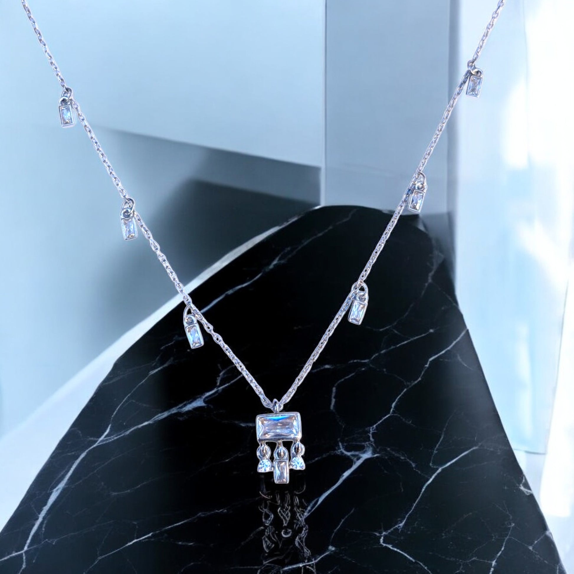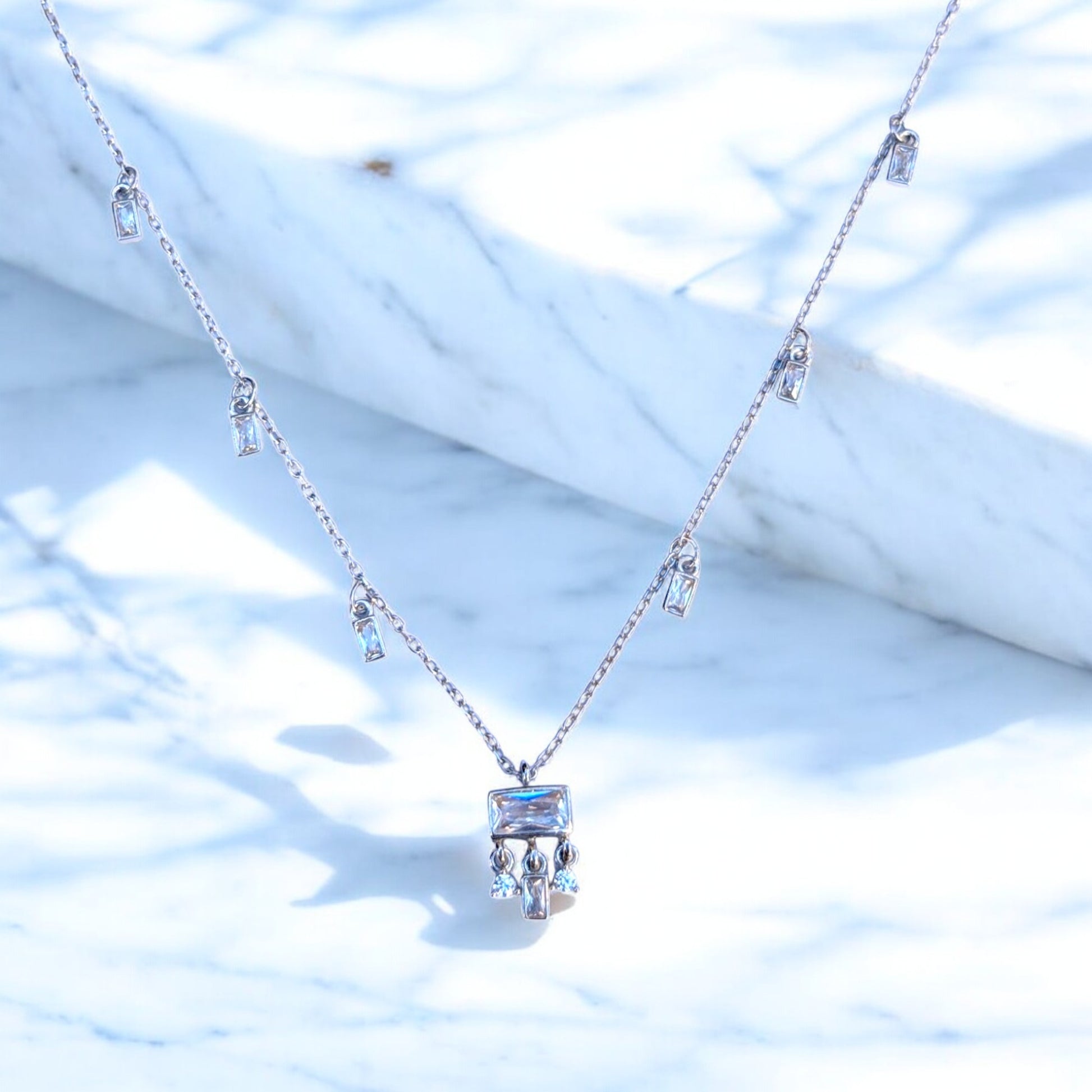 - Elegant Baguette Design – Features baguette-shaped cubic zirconia stones set in a station necklace design, offering a modern and sophisticated look.