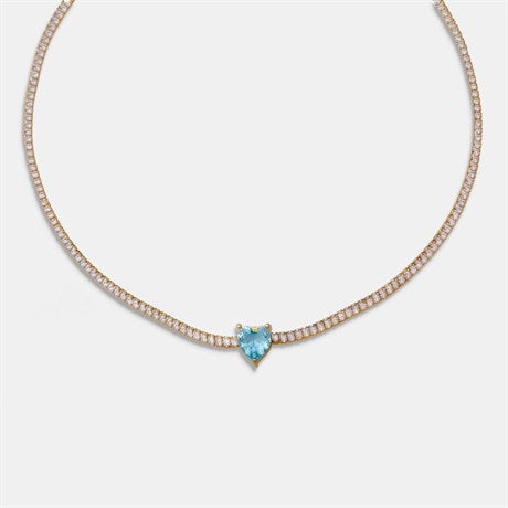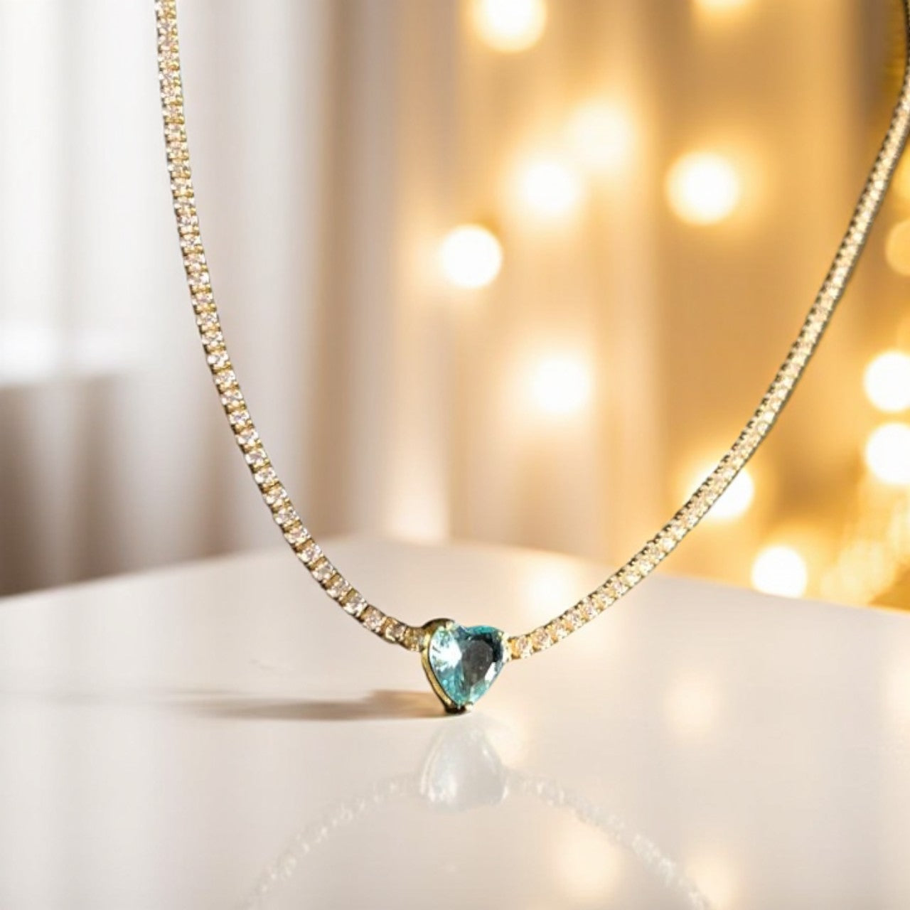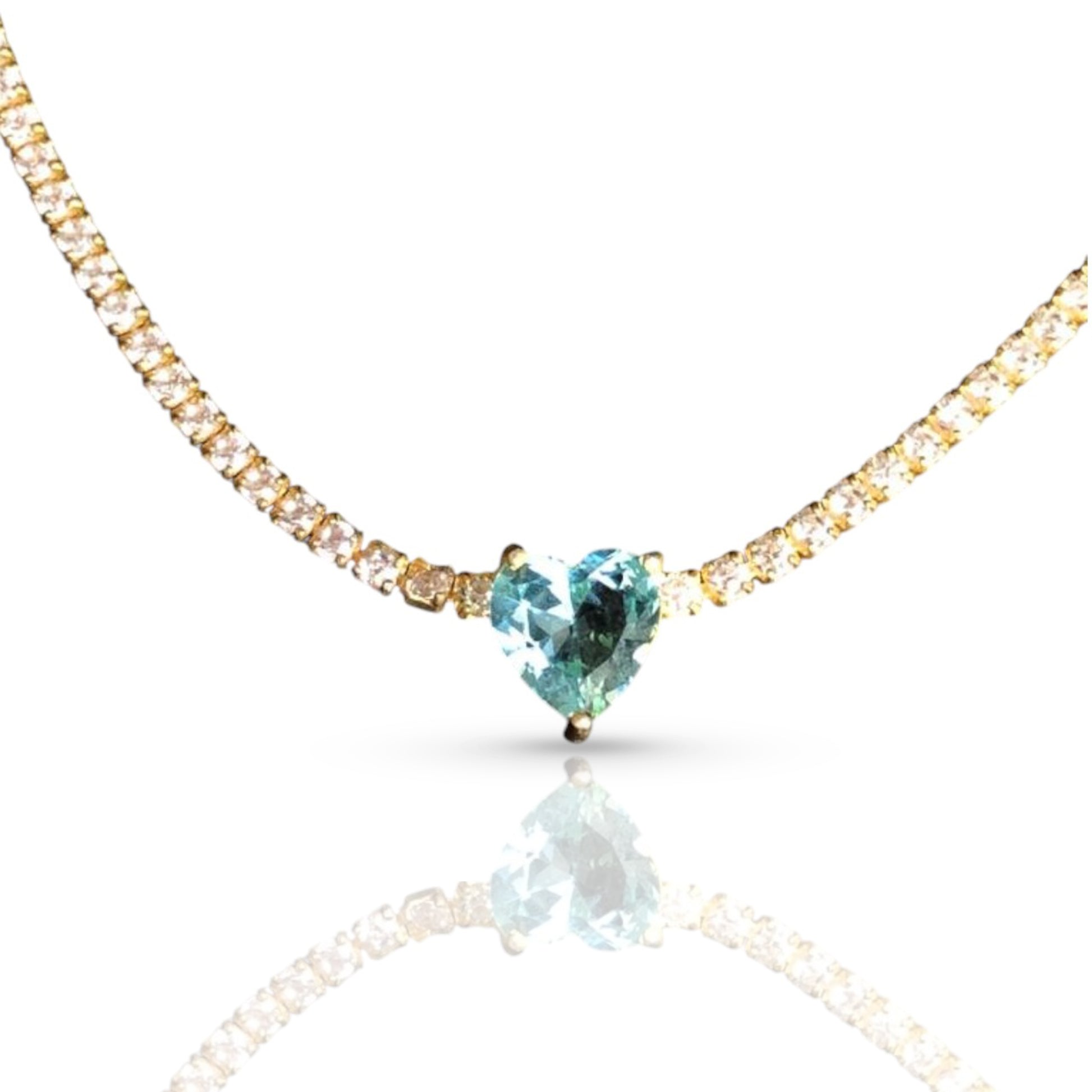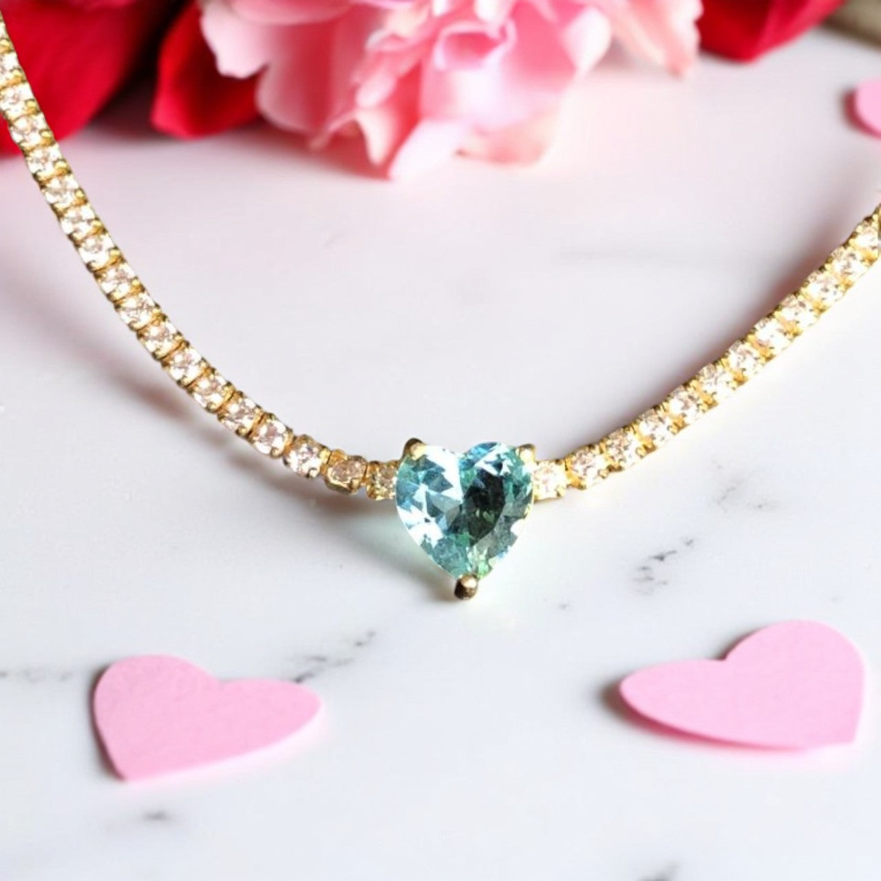 Sterling Silver necklace with blue cz and heart shape.the chain is cz stones all the way to the end.