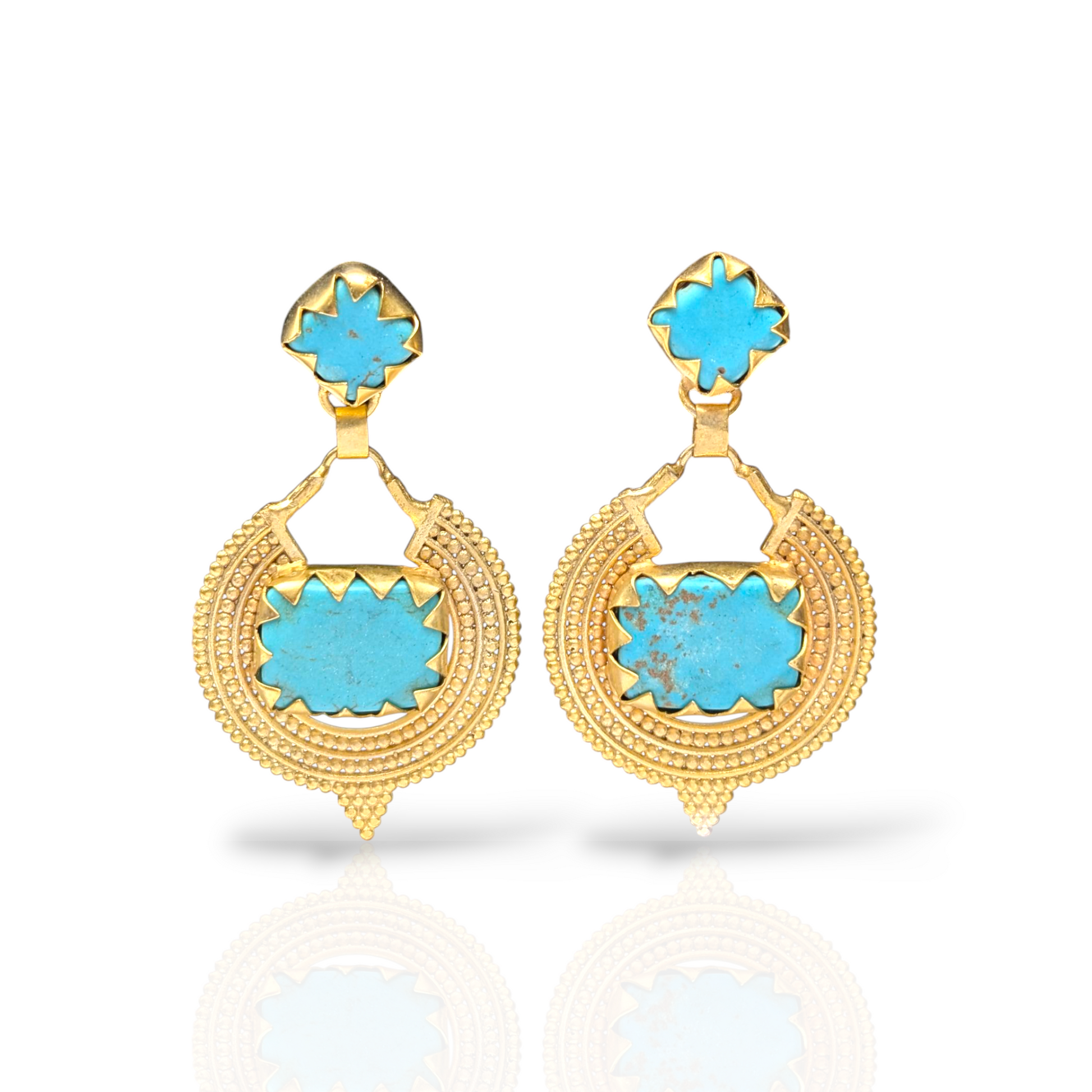 Infuse your style with earthy elegance and artisanal charm using these handmade turquoise gold earrings. Expertly crafted in Turkey, each pair showcases the vivid, sky-blue hues of natural turquoise stones, set in warm gold-plated brass for a striking contrast that blends raw beauty with refined luxury.