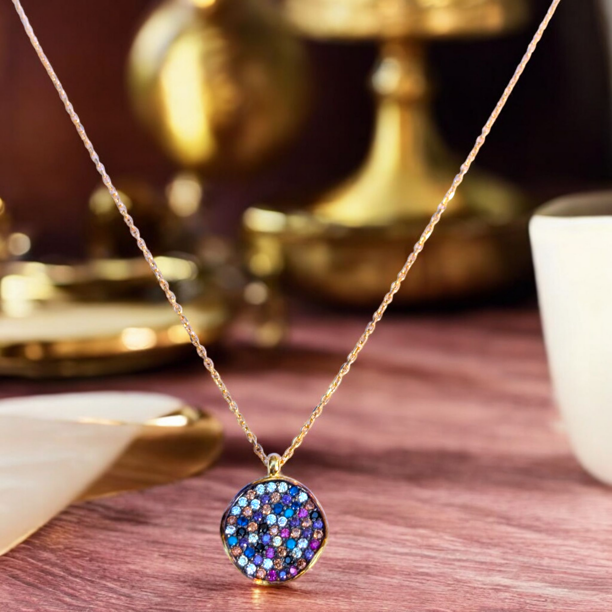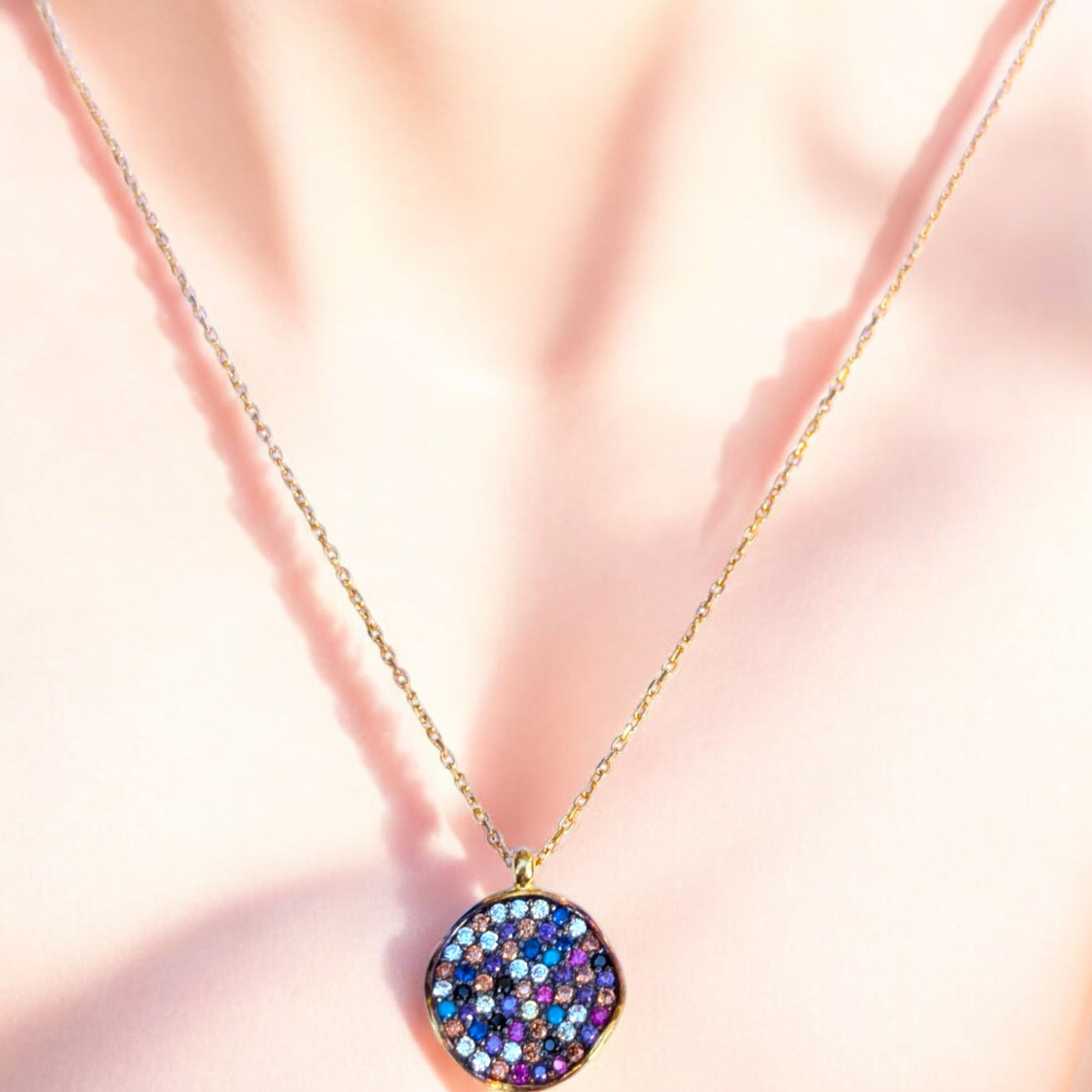 Elegant Design: This multicolor pavé disc necklace features a gold-tone chain paired with a round pendant encrusted with an array of small, colorful CZ crystals, including shades of blue, pink, purple, and white.