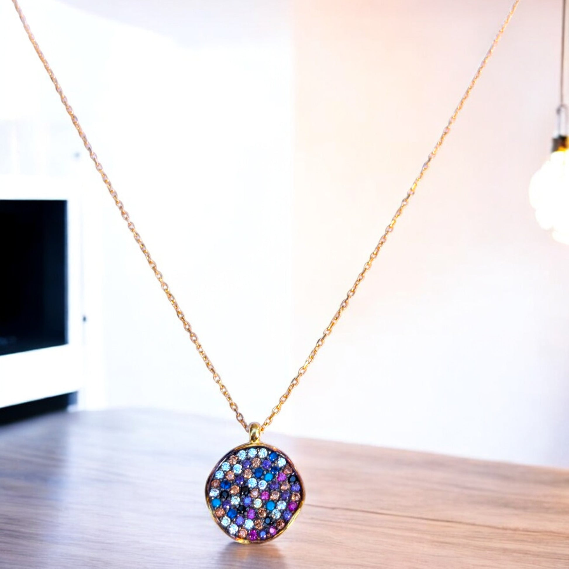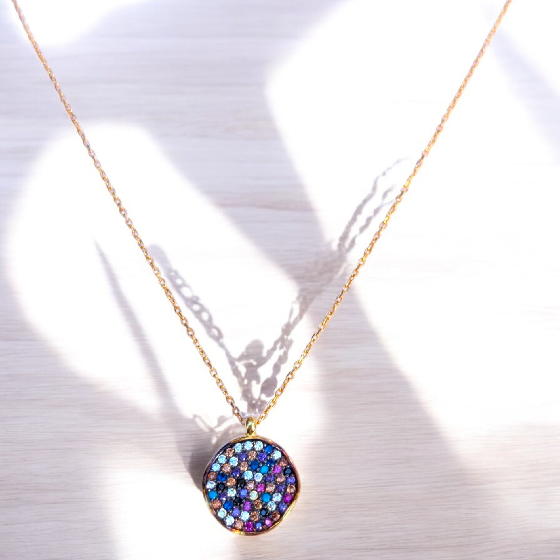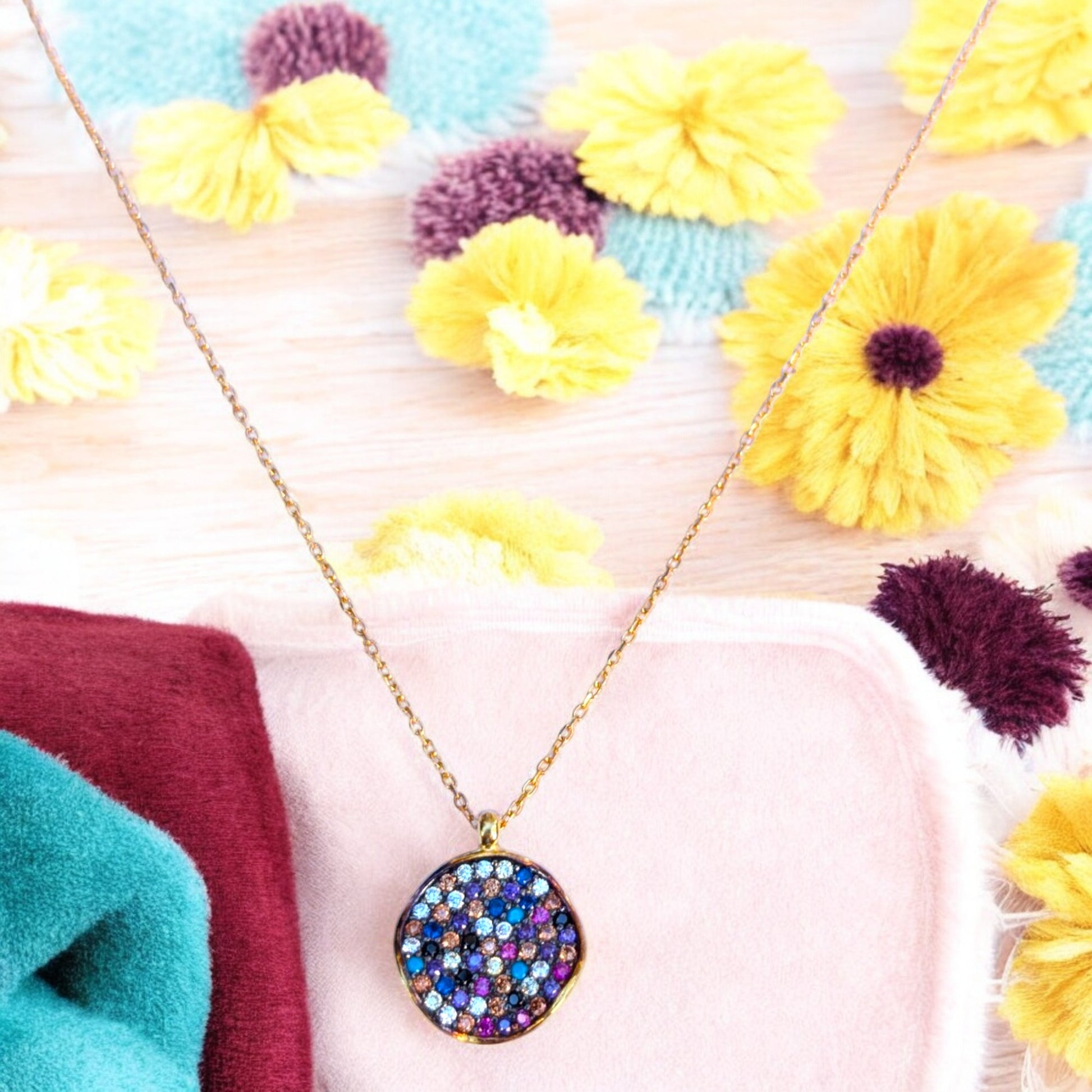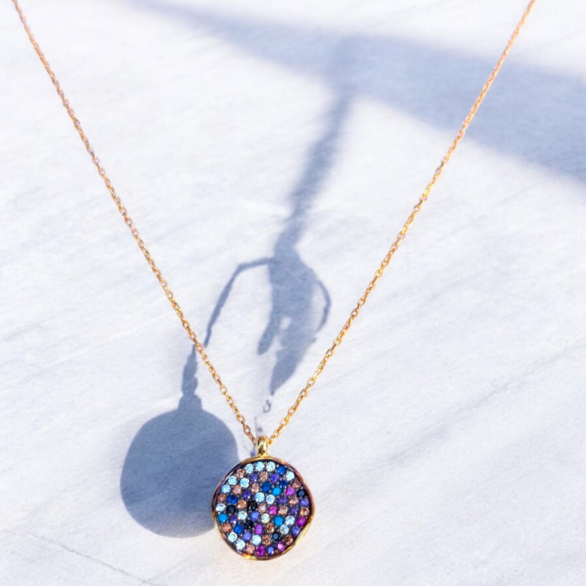 Upgrade your jewelry collection with this Multicolor Pavé Disc Necklace, blending elegance and vibrancy effortlessly! 💖
