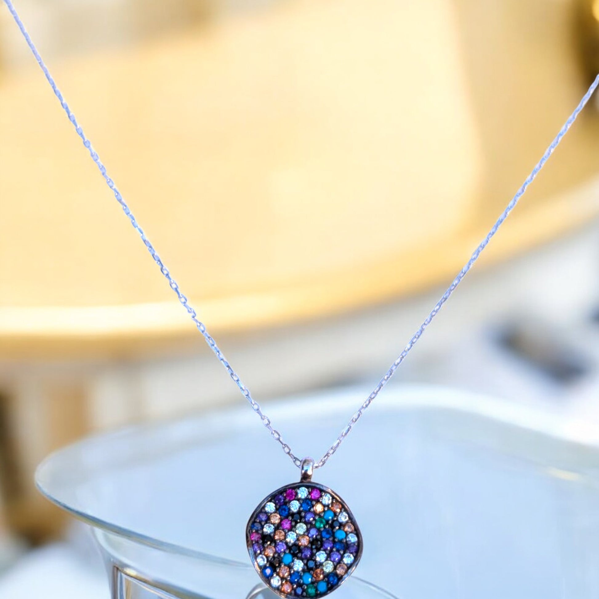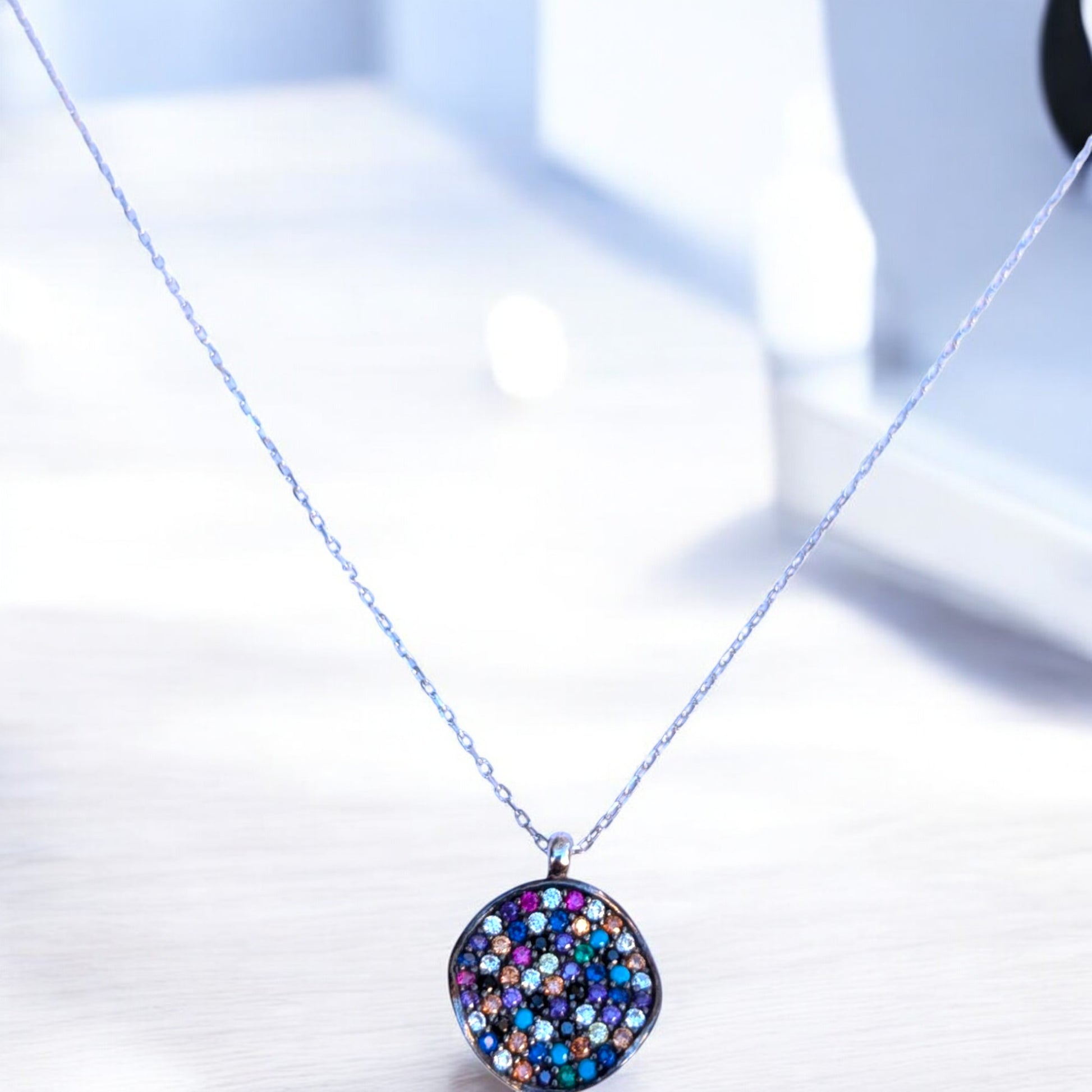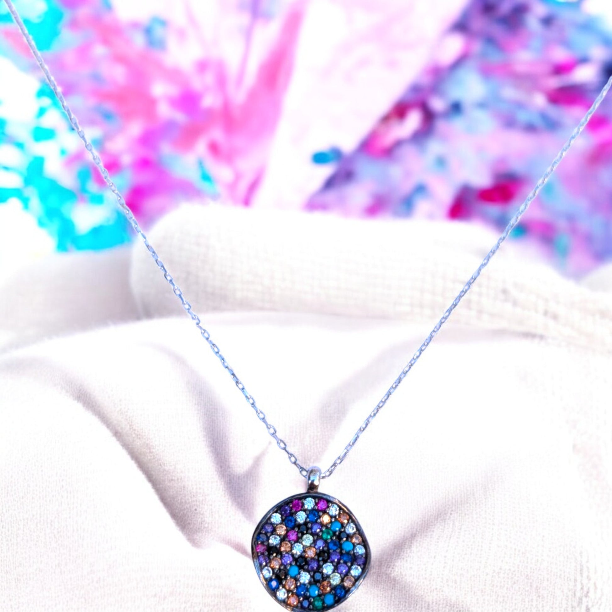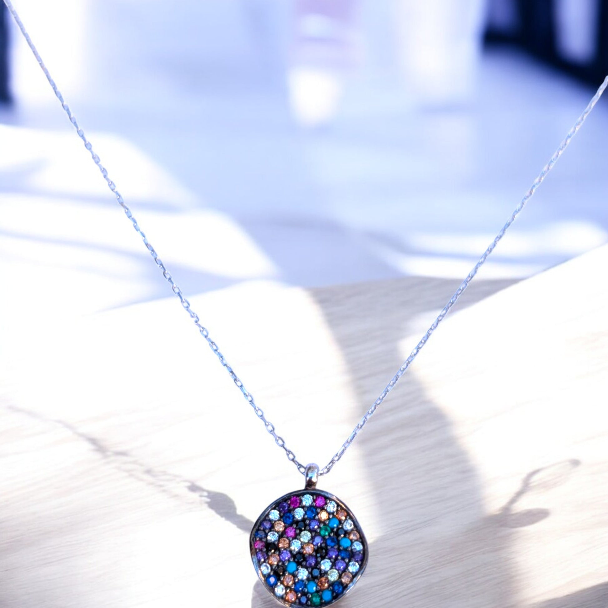 Upgrade your jewelry collection with this Multicolor Pavé Disc Necklace, blending elegance and vibrancy effortlessly! 💖