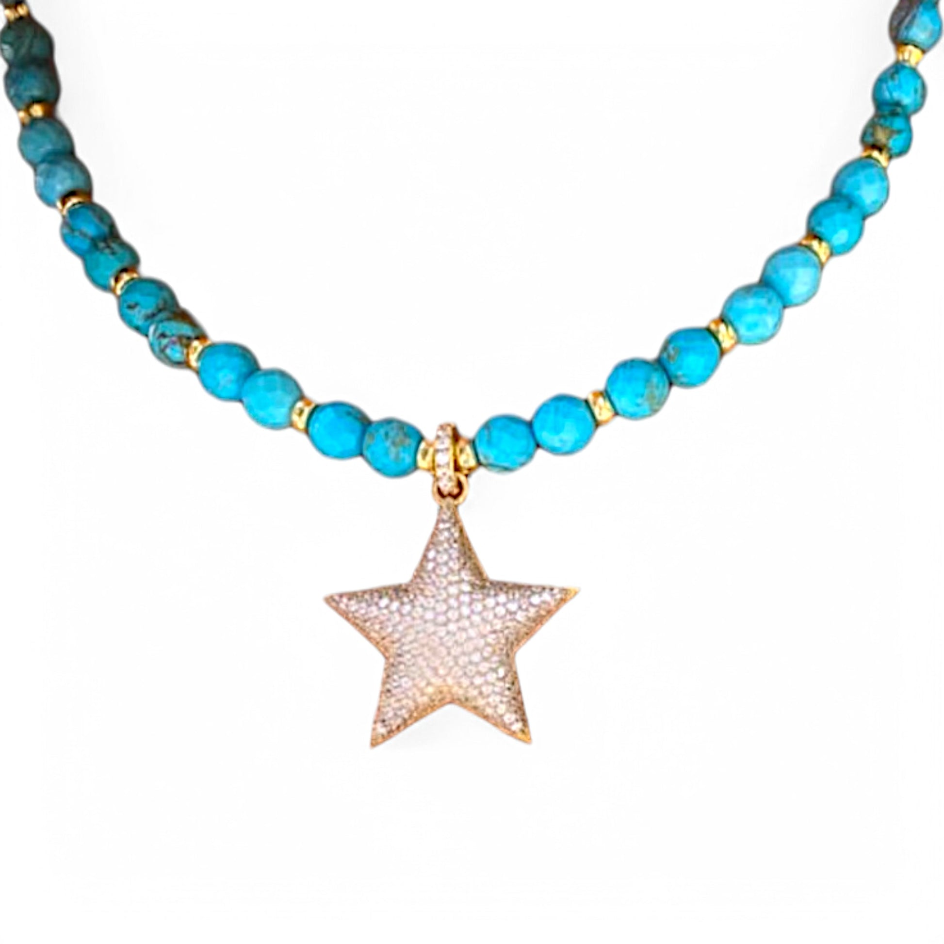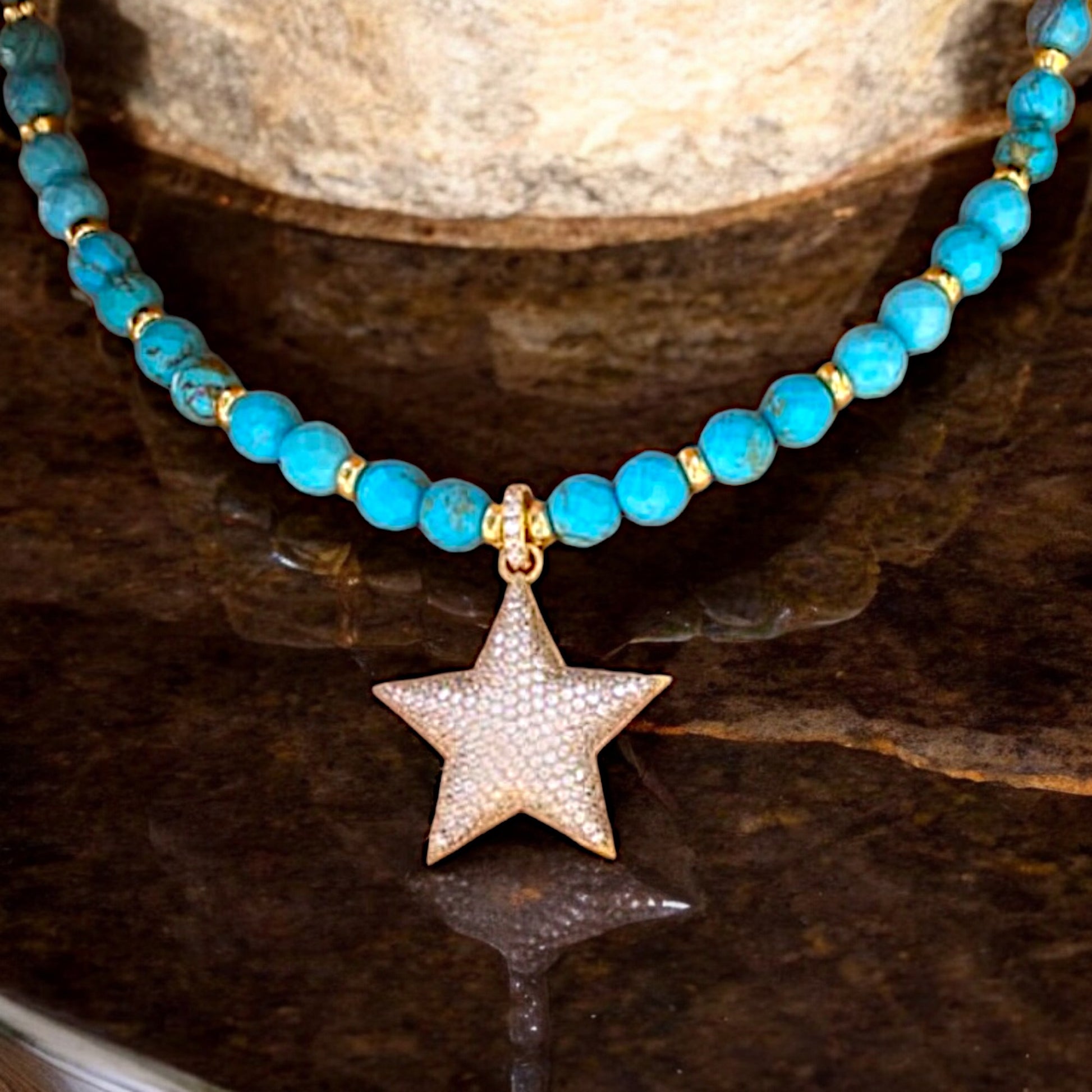 This eye-catching pendant hangs from a strand of natural turquoise beads, their rich blue-green hues varying slightly for organic charm, accented by delicate gold beads that add a touch of refinement. The combination creates perfect harmony between earthy elegance and celestial sparkle.