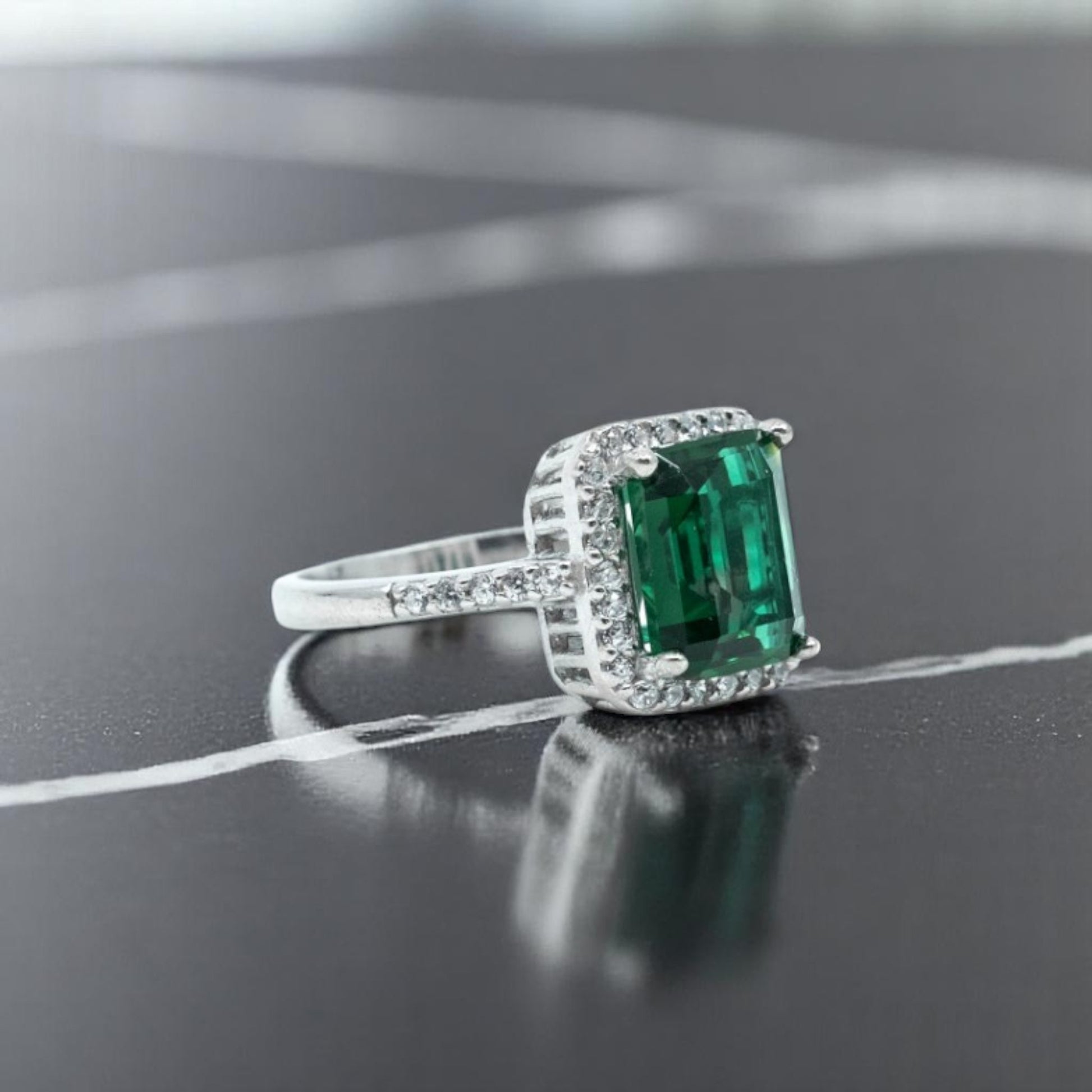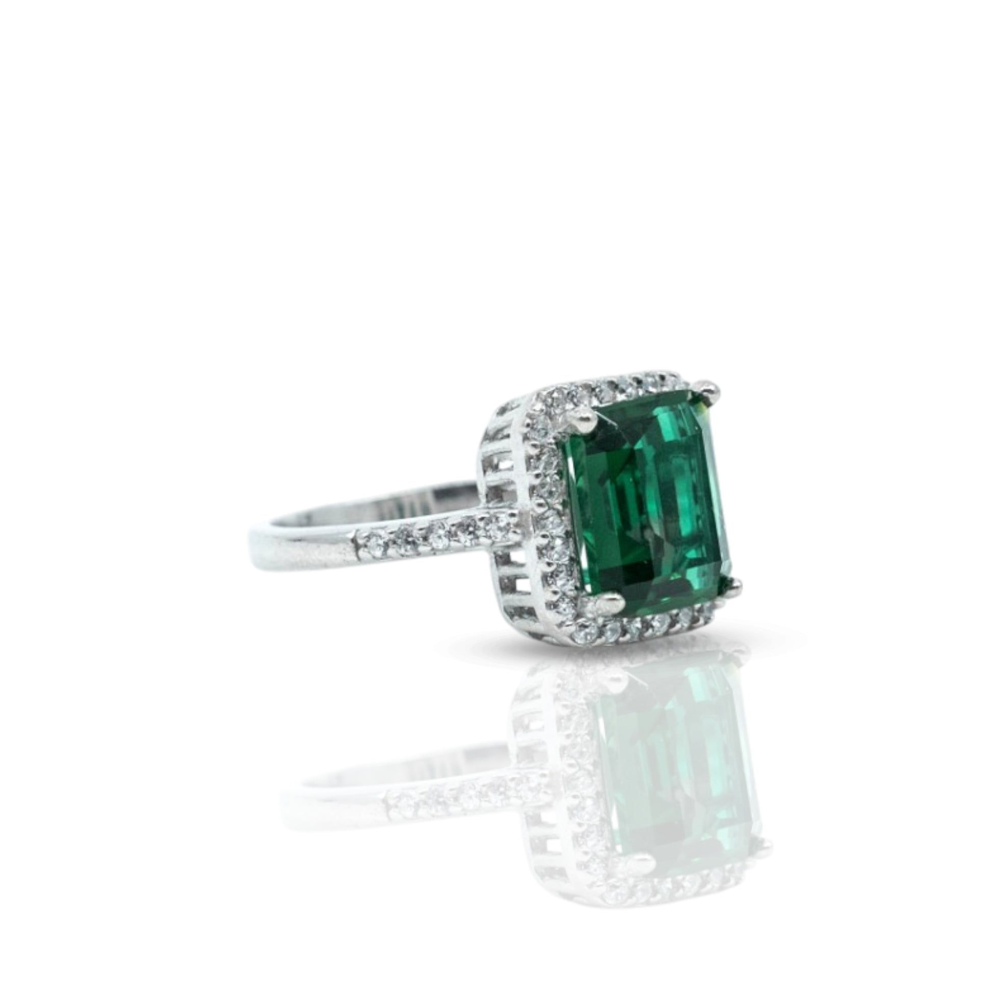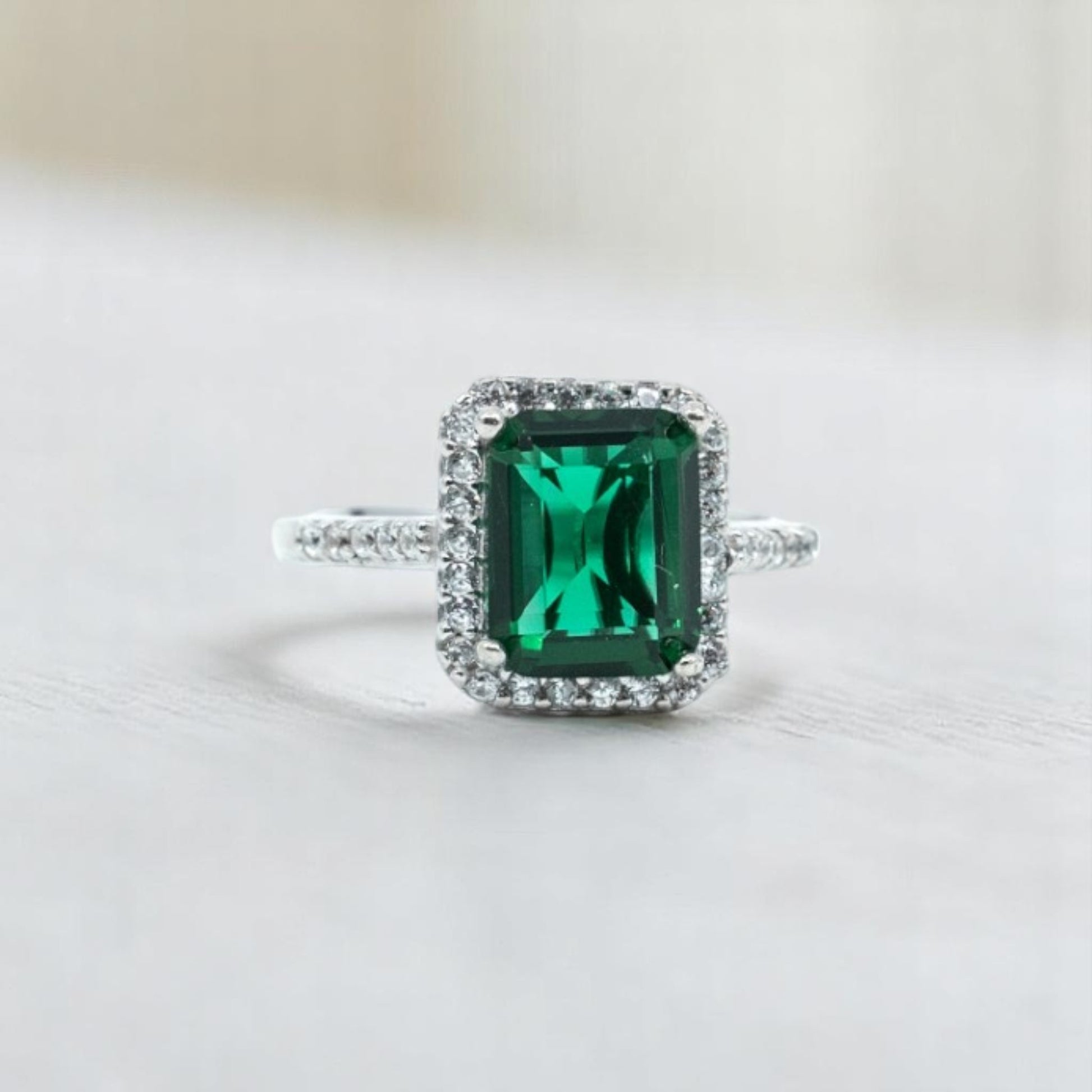 Beautiful emerald cut ring for a unique and romantic look. The metal is Sterling silver and rhodium plated over. It does not tarnish.
