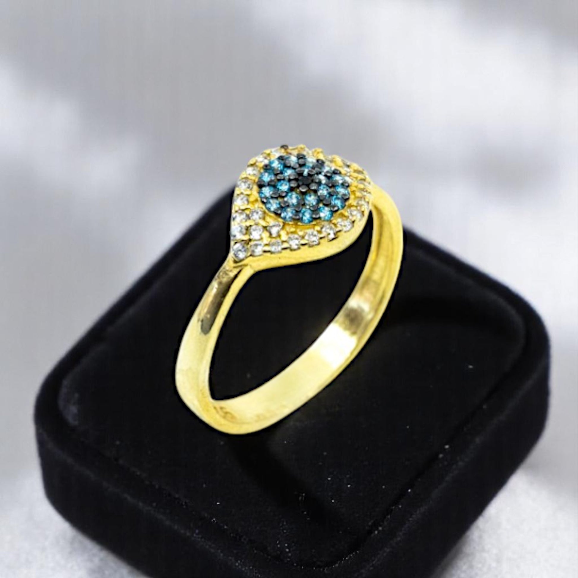The Evil Eye Ring is designed with a smaller evil eye and tiny sparkling stones that make the ring look more elegant. The ring is adjustable.