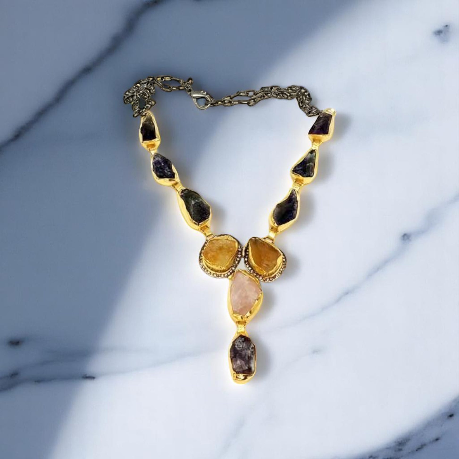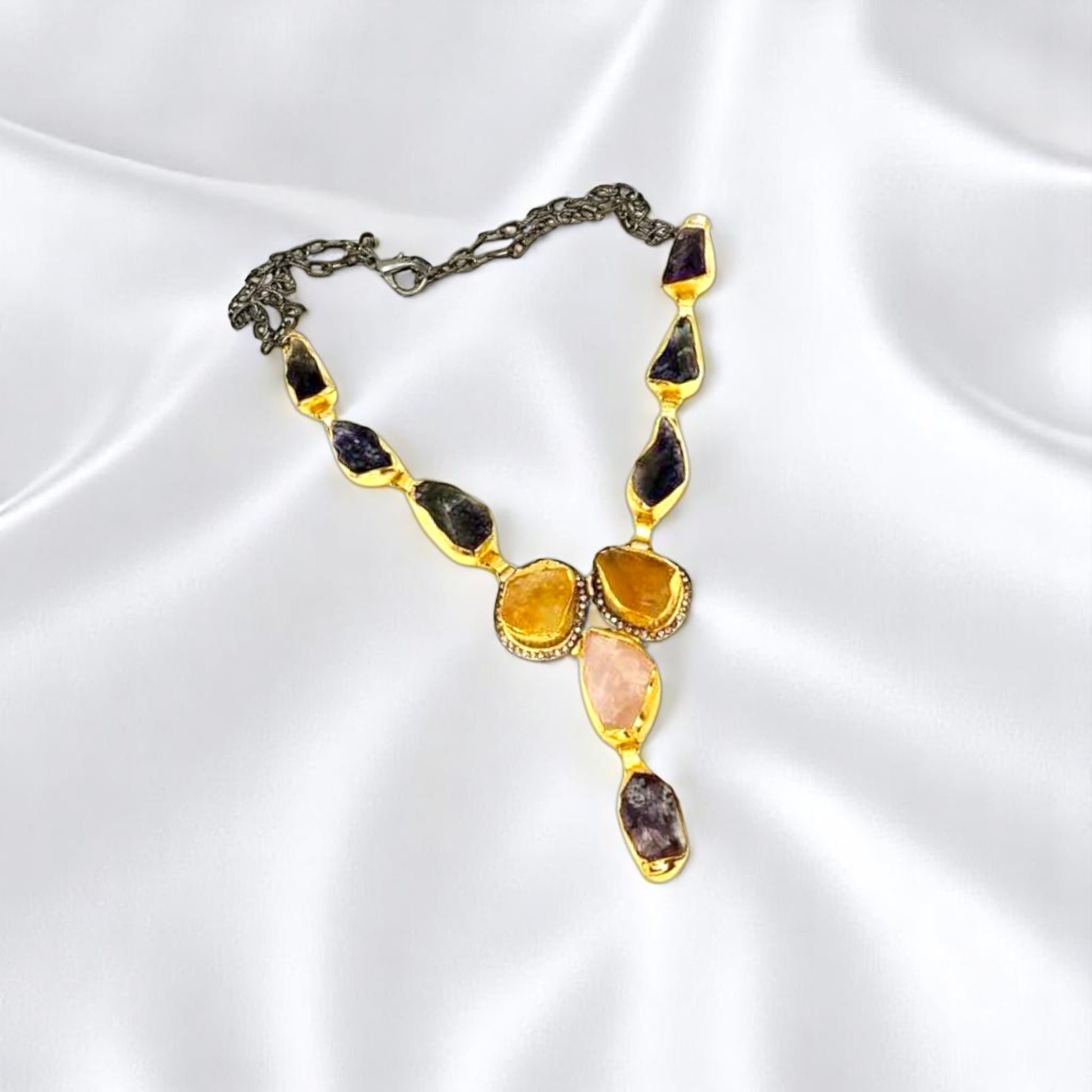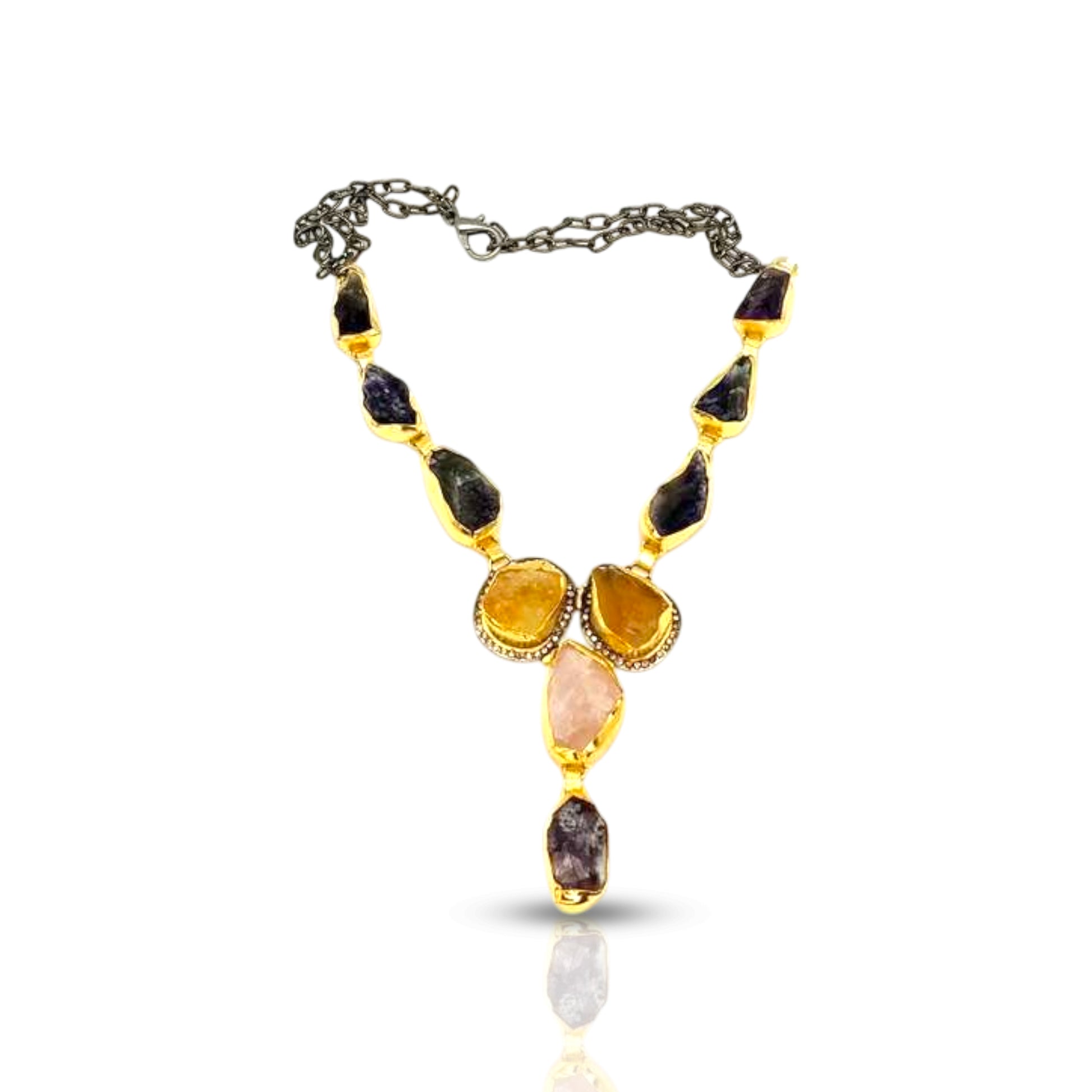 Rough Amethyst, Rough Rose Quartz, and Rough Citrin Gold Necklace