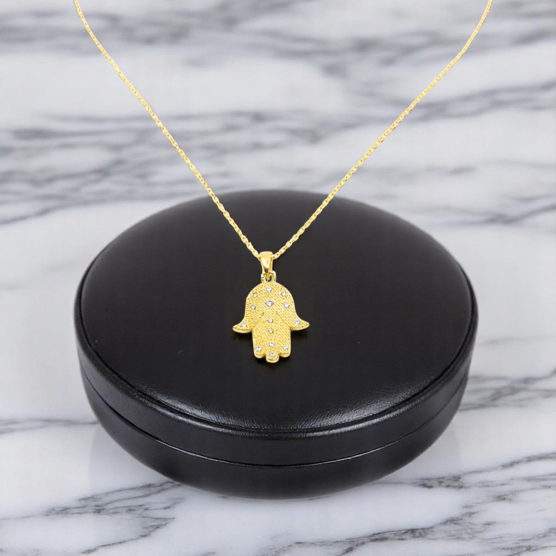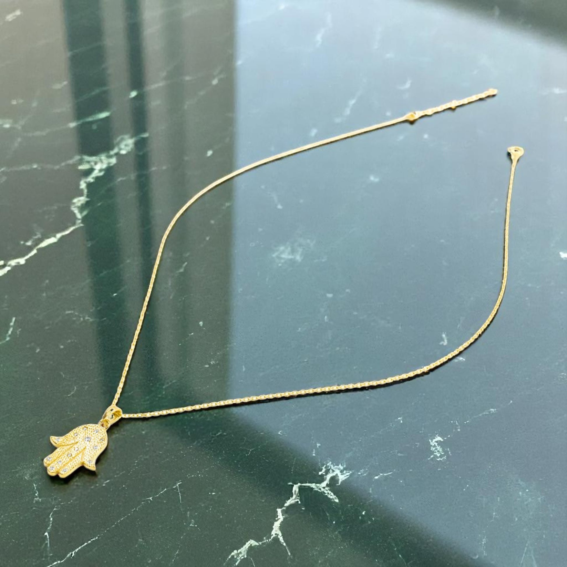 Dainty Gold Hamza Necklace with CZ Diamond stones. This charming necklace will protect you from the evil eye.