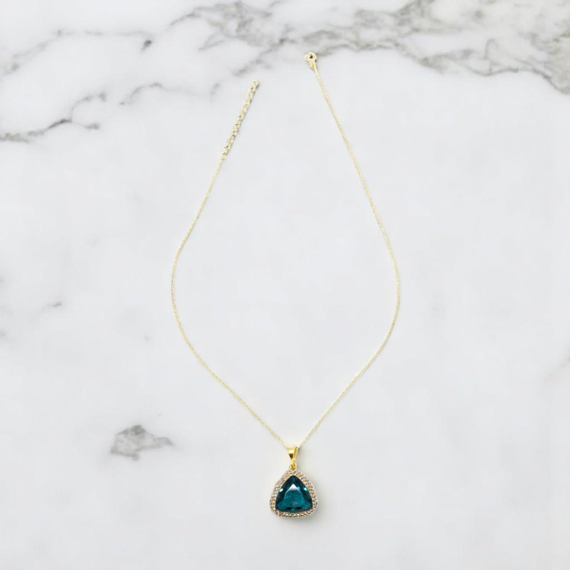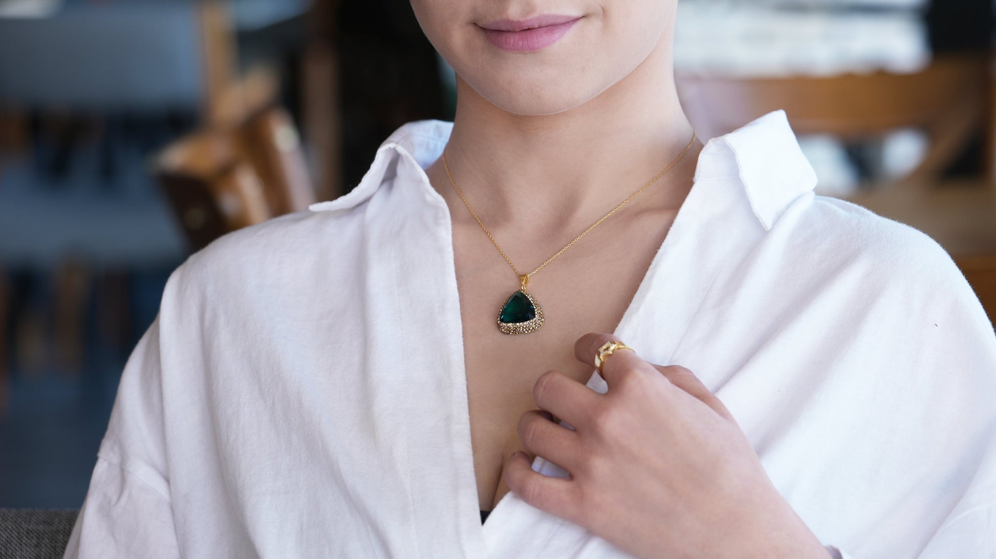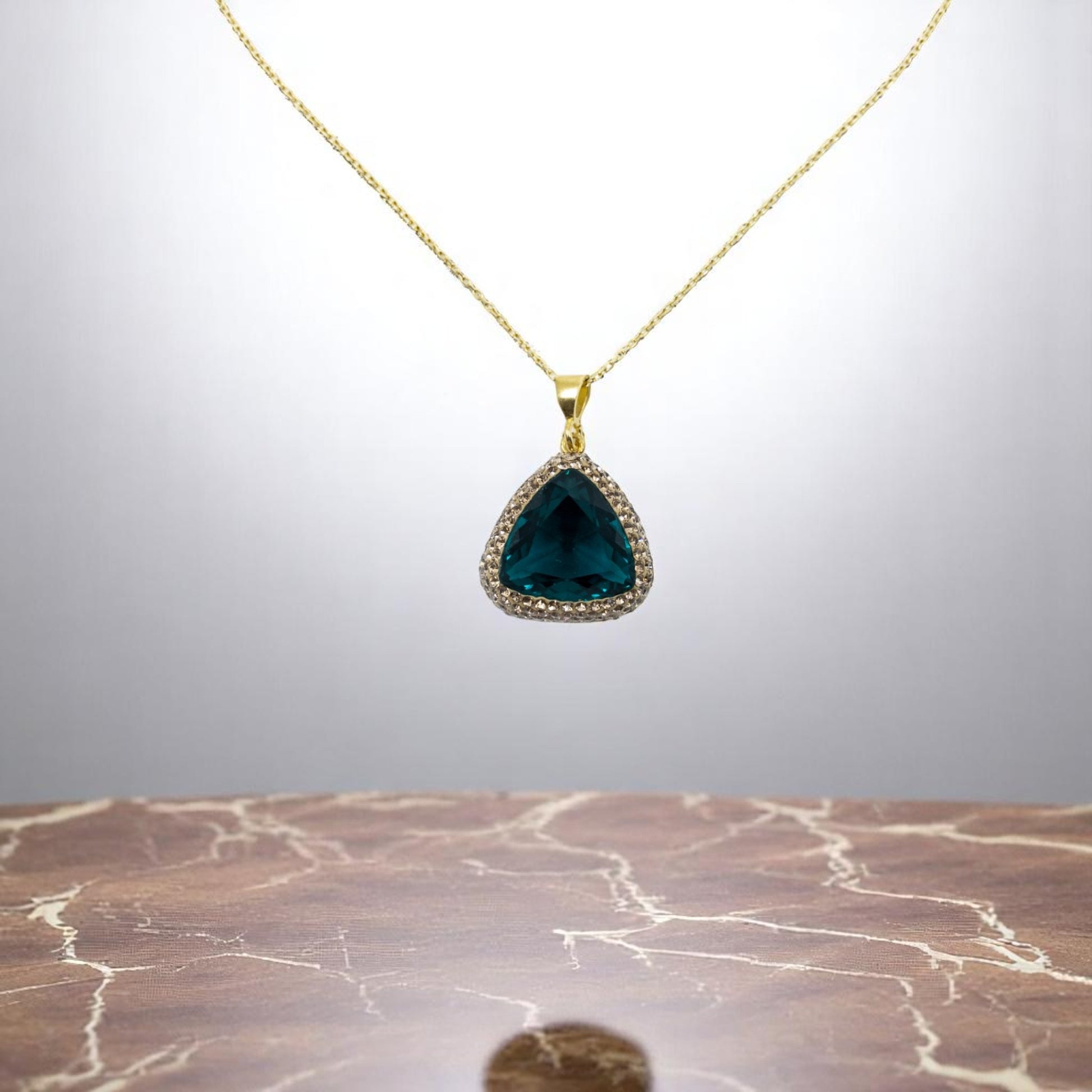Gold Emerald Necklace with sparkly triangle shade that catches the eye.