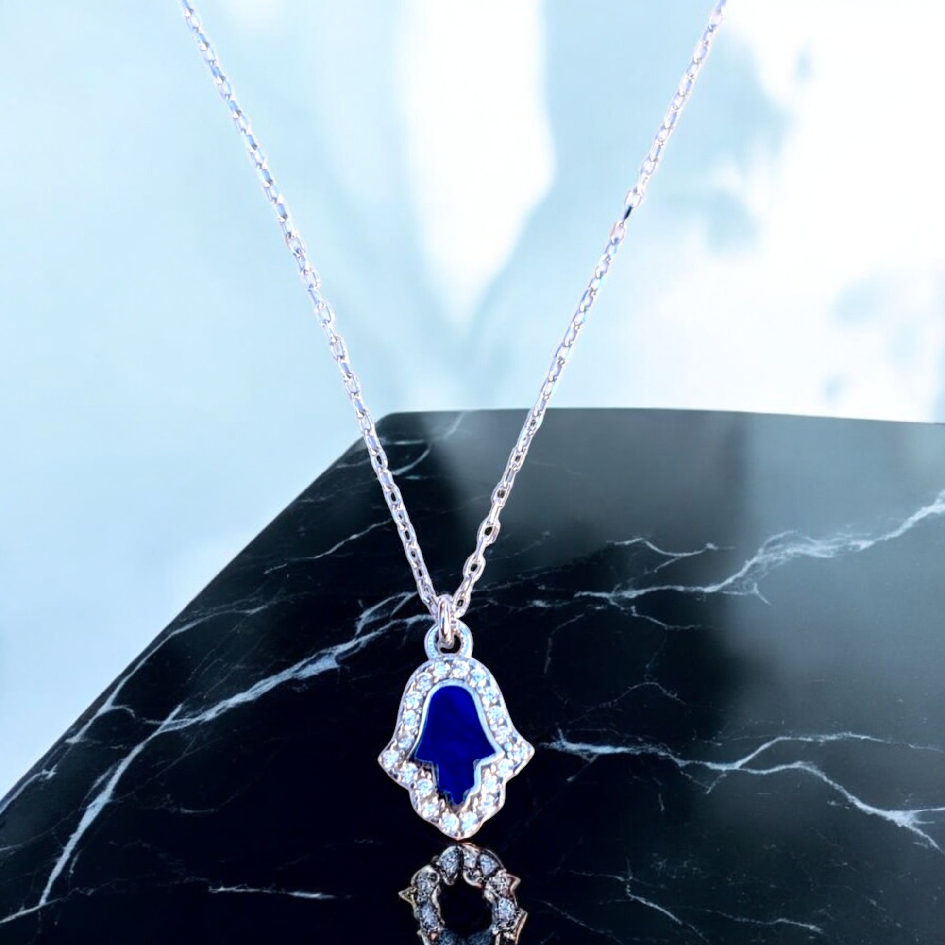 Embrace the power of protection and positivity with this exquisite Hamsa hand evil eye necklace. Featuring a beautifully crafted Hamsa hand pendant adorned with a dark blue evil eye design and surrounded by sparkling clear stones (likely cubic zirconia), this necklace is more than just a piece of jewelry—it’s a talisman of good fortune, health, and happiness. The Hamsa, also known as the Hand of Fatima, is a timeless symbol believed to ward off negative energy and the evil eye, while the dark blue evil eye adds an extra layer of protection against envy and misfortune. Whether you wear it facing up for protection or down to attract positivity, this necklace is a meaningful and stylish addition to any jewelry collection.