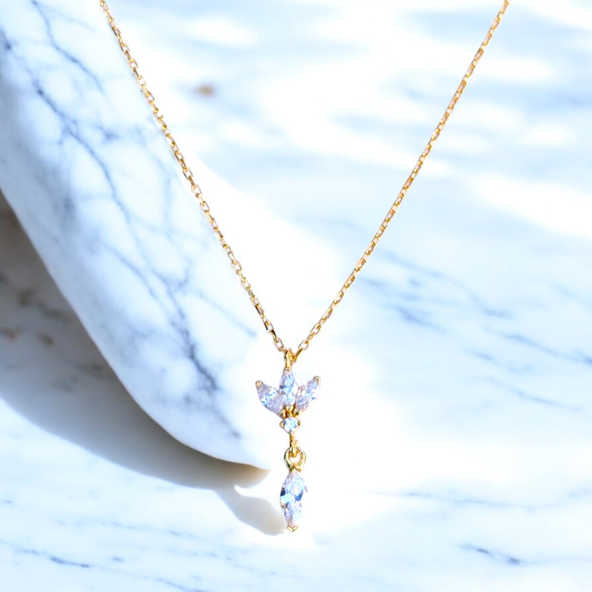 Elevate your style with the Trio Lotus Gold Necklace, a delicate and elegant piece of jewelry that combines timeless design with modern sophistication. This stunning necklace features a beautifully crafted lotus pendant adorned with sparkling cubic zirconia stones. The pendant showcases three leaf-shaped crystals at the top, a small round crystal in the center, and a teardrop-shaped crystal dangling at the bottom, creating a harmonious and eye-catching design. Made from high-quality sterling silver with a luxurious gold plating, this necklace is perfect for adding a touch of sparkle to any outfit. Whether you're dressing up for a special occasion or adding a subtle accent to your everyday look, the Trio Lotus Gold Necklace is a versatile and meaningful addition to your jewelry collection.