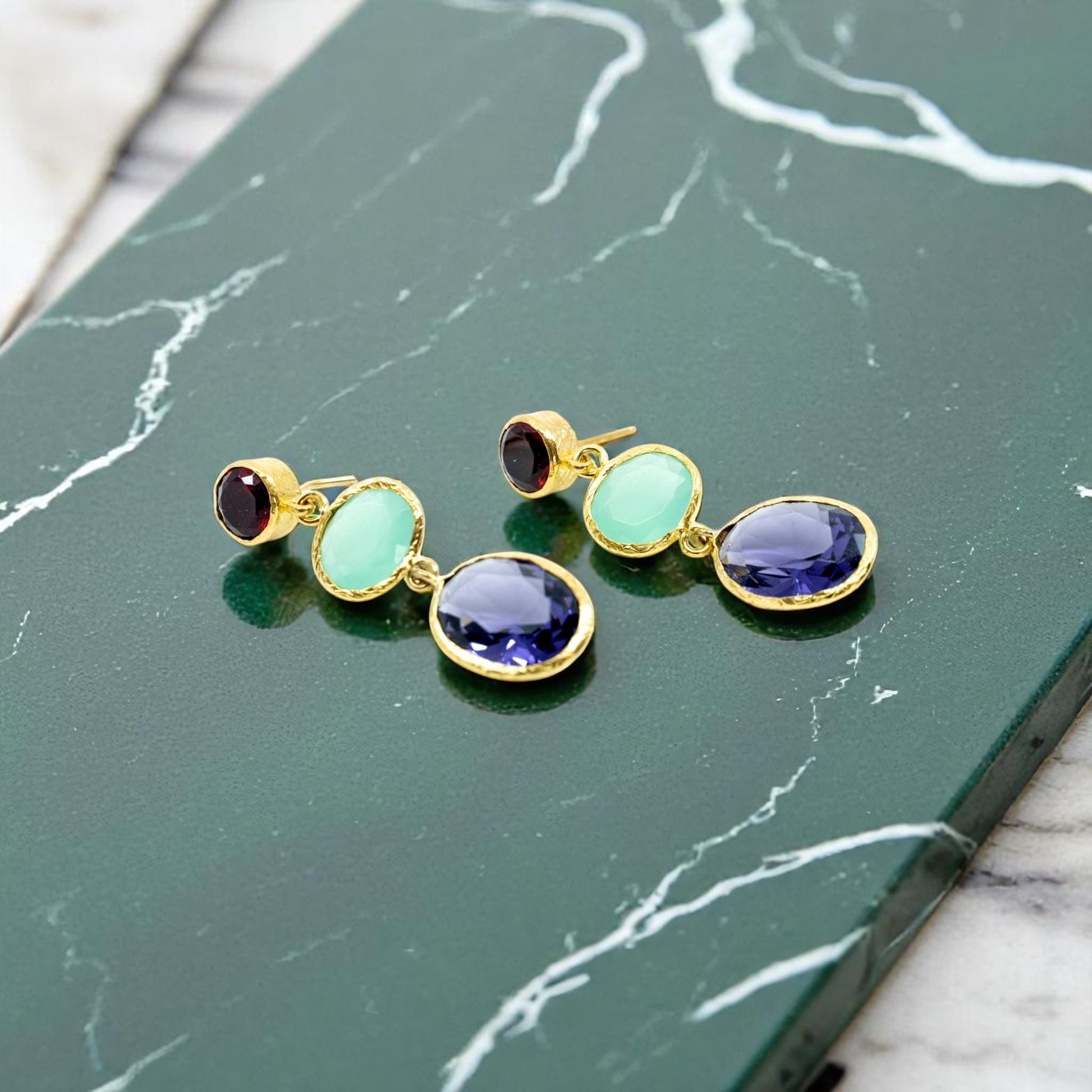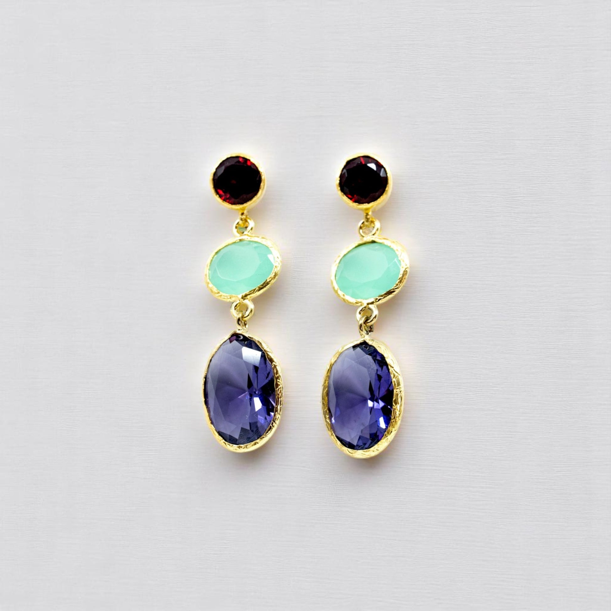 Beautiful dangling earring with three sized stones that come in red, blue and purple.