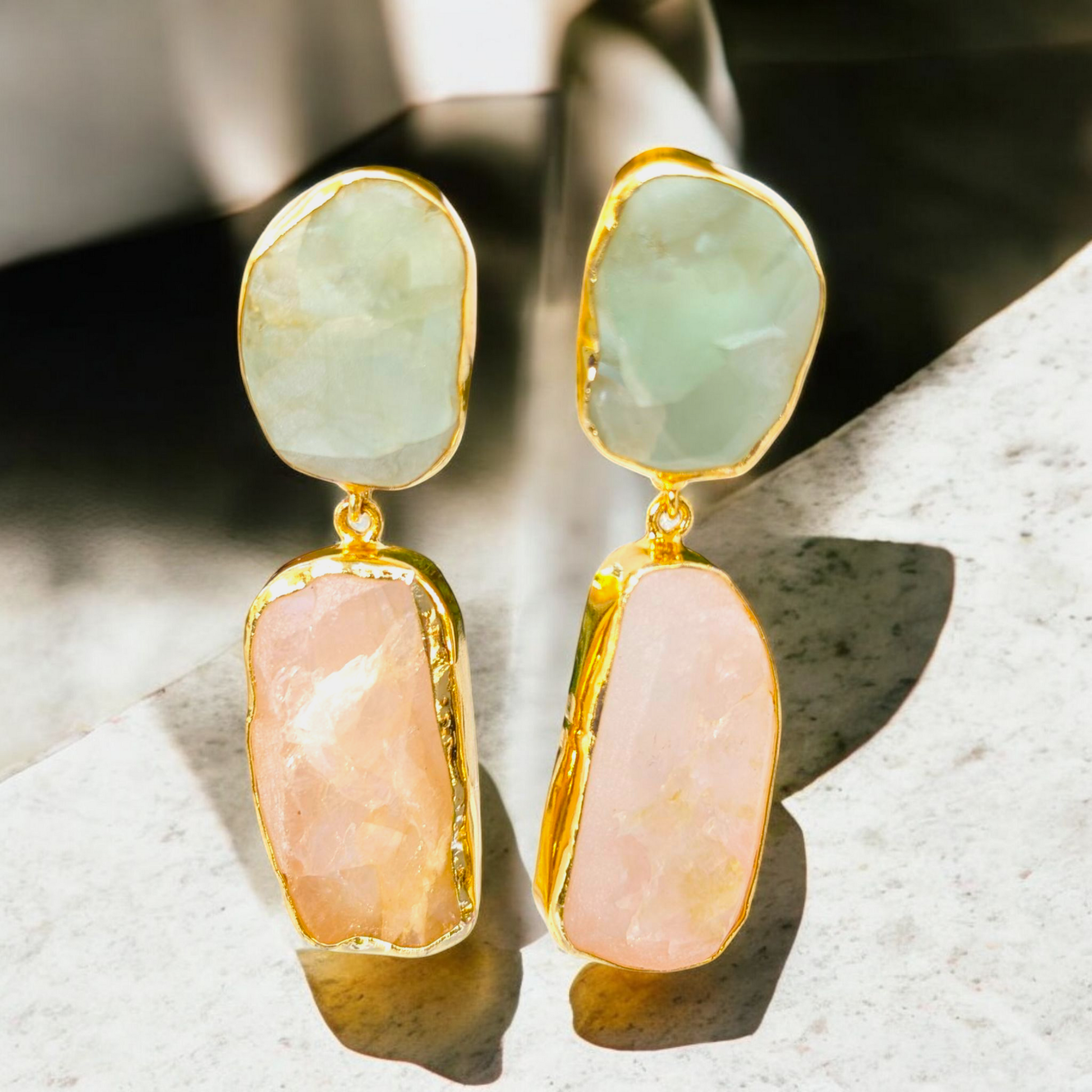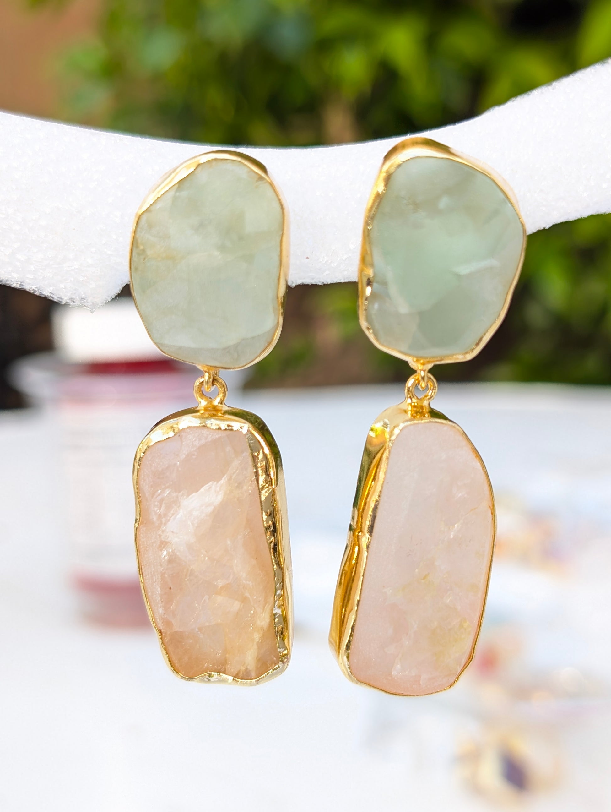 Rough Apatite and Rough Rose Quartz Stone Handmade Gold Stud Earrings
