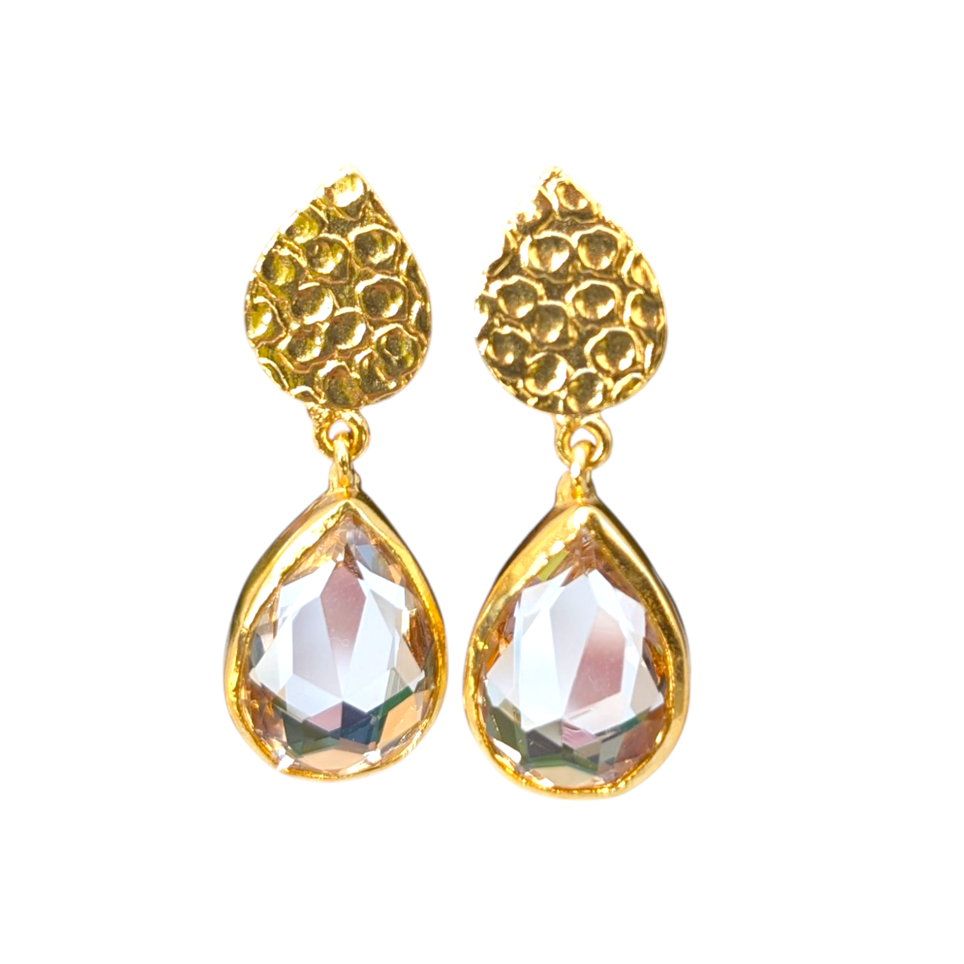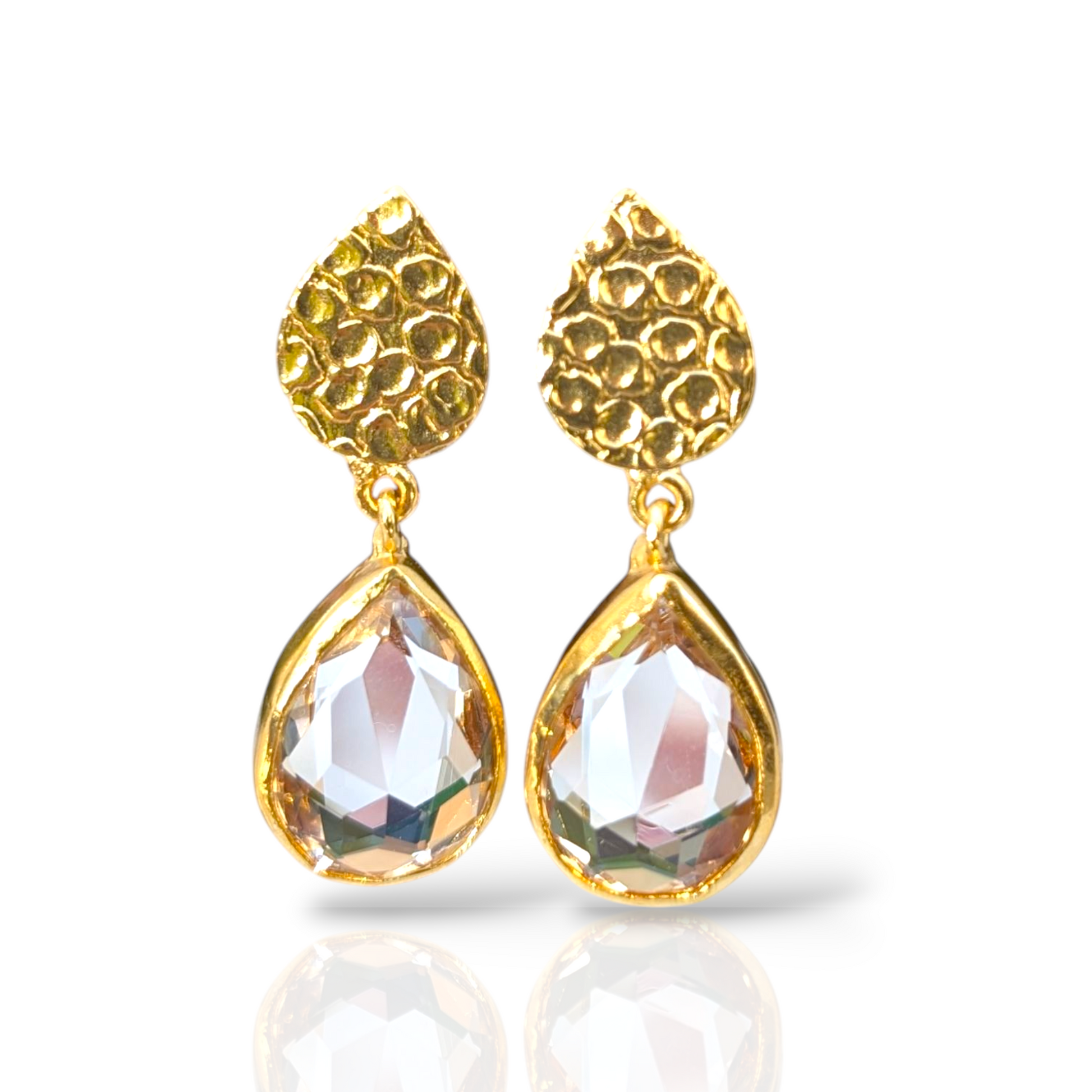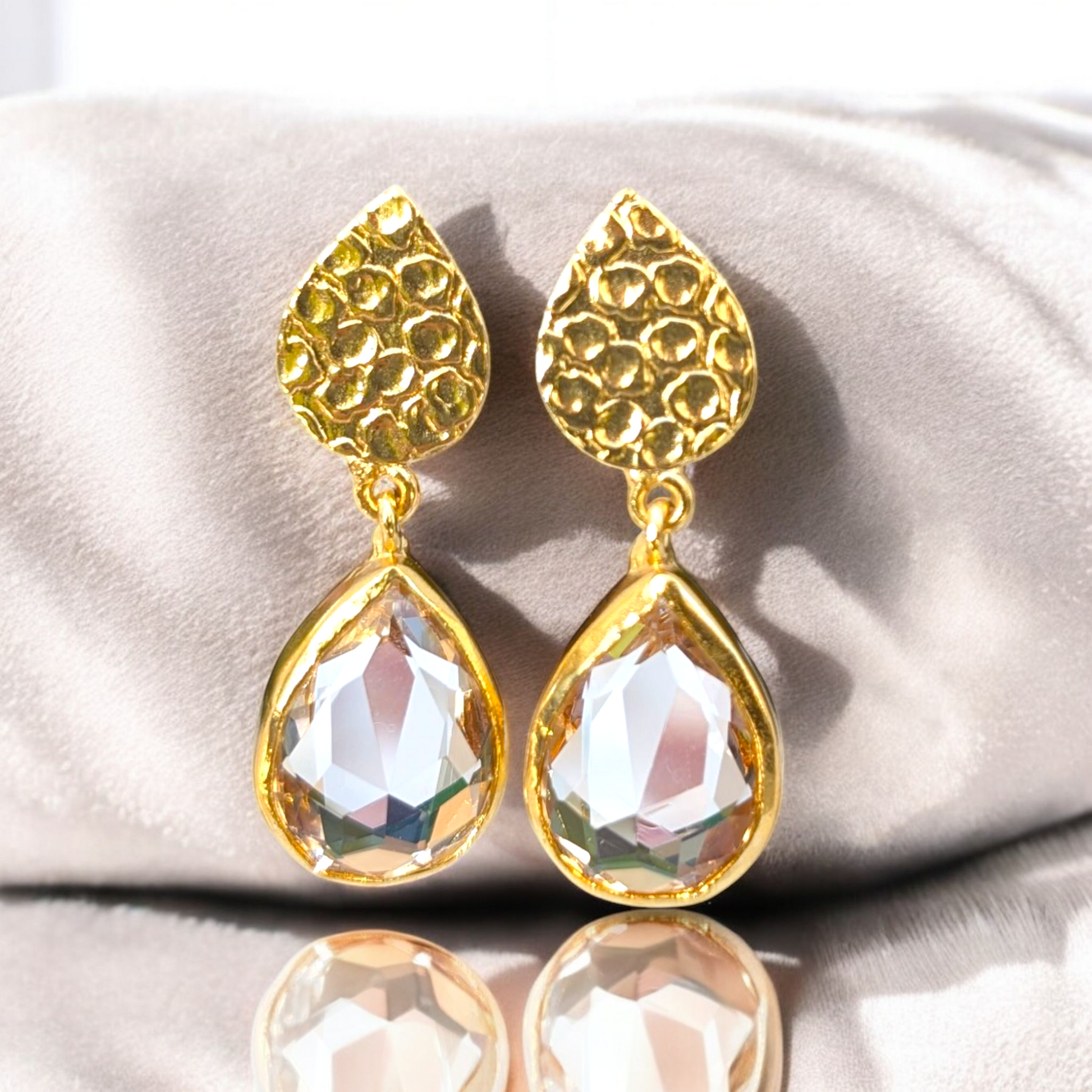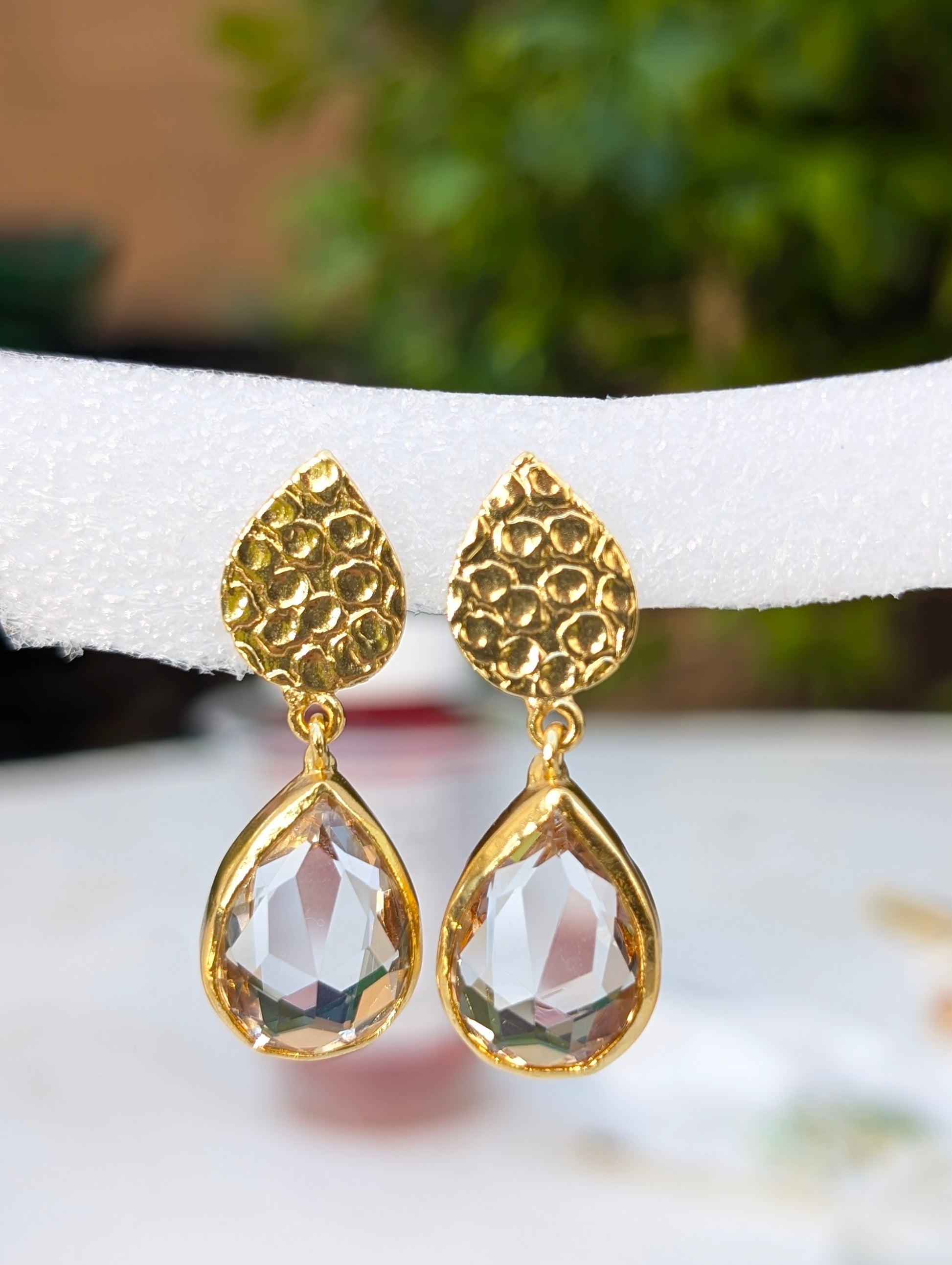Elevate your look with these effortlessly chic handmade gold-plated earrings, featuring delicate clear glass for a timeless and versatile appeal. Expertly crafted in Turkey, each pair combines the brilliance of natural glass with the warm glow of gold-plated brass, creating a refined yet understated elegance.