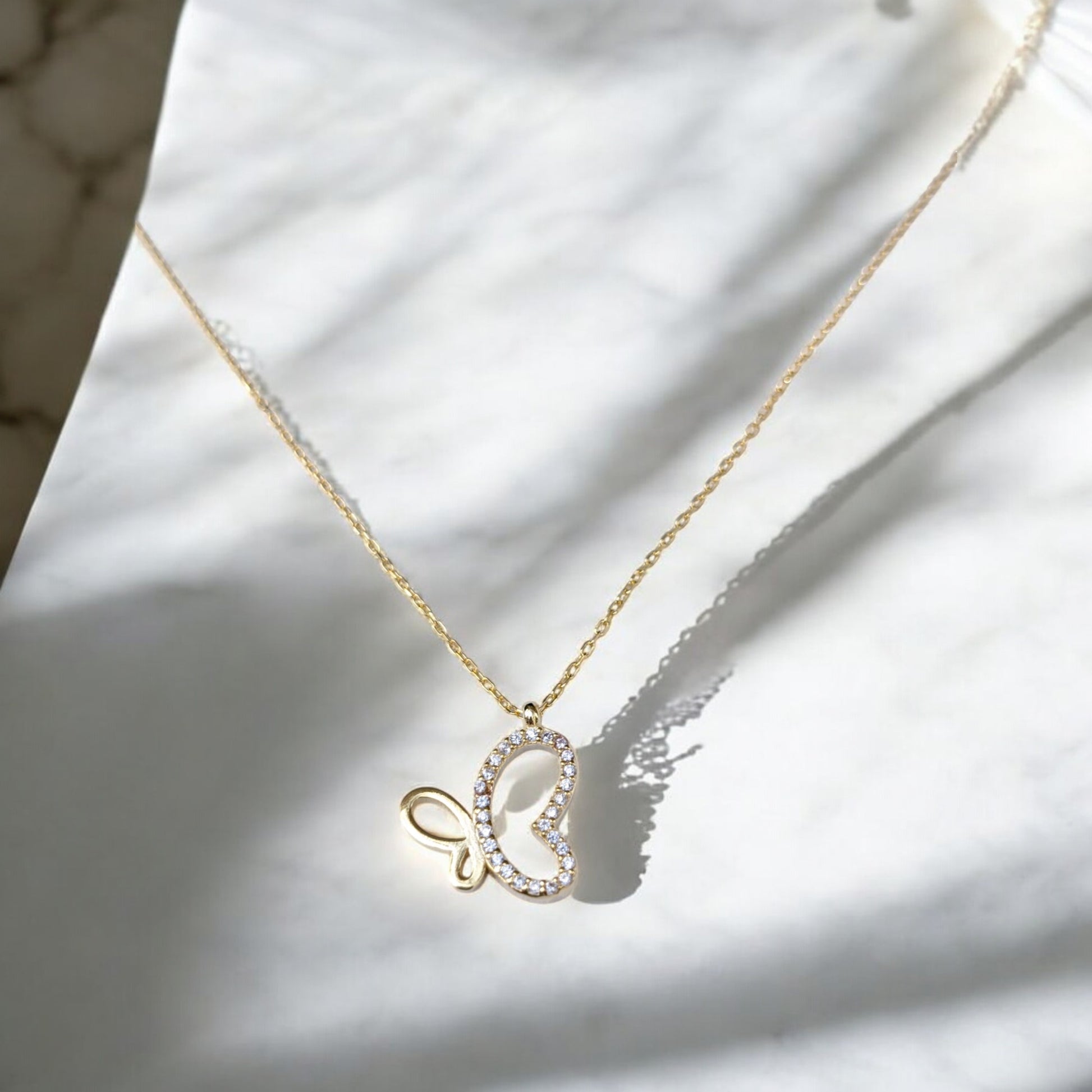 🦋 Butterfly Pendant: A delicate butterfly design outlined in gold and encrusted with small, clear stones.