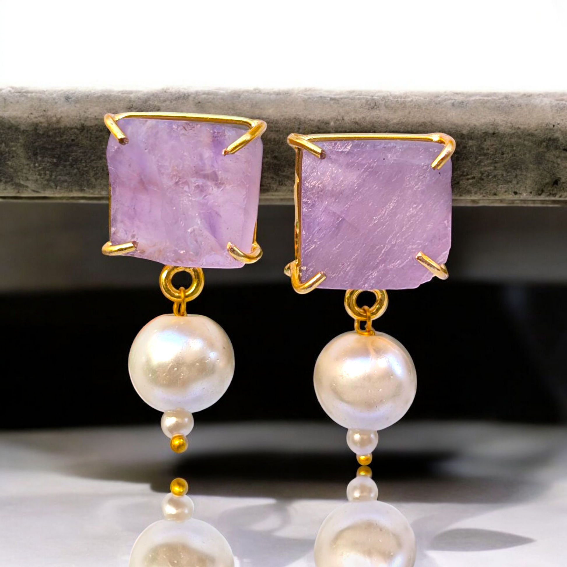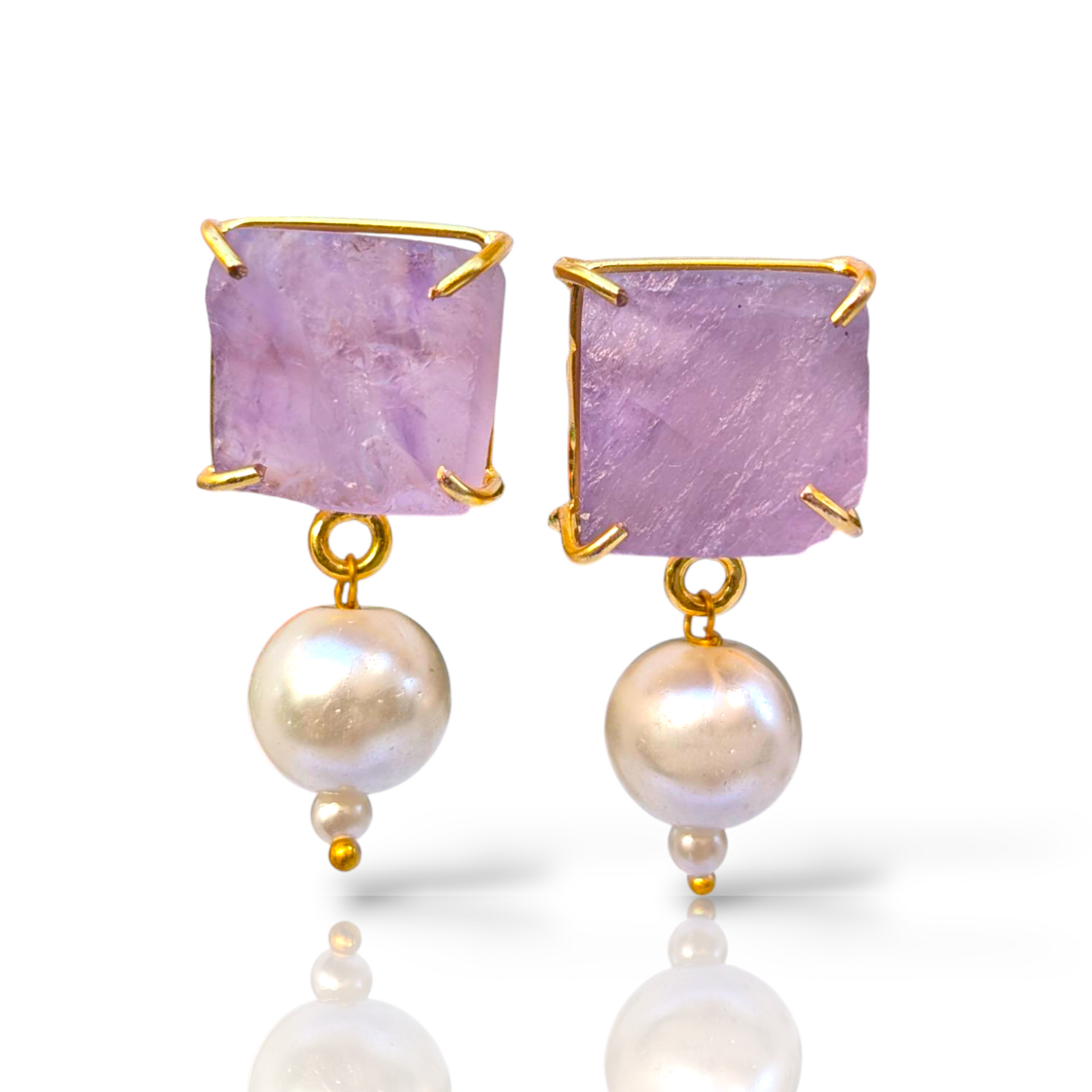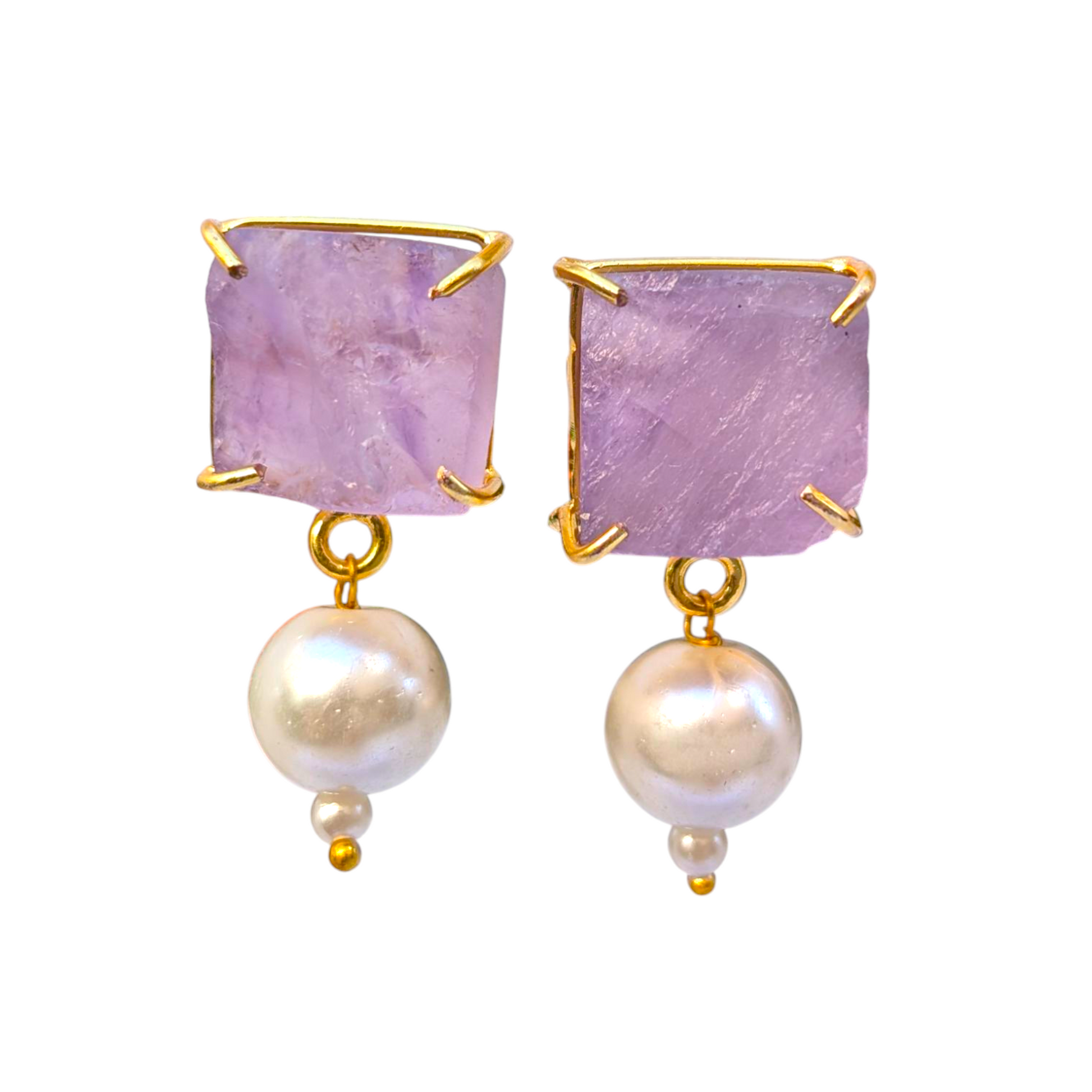 Elevate your style with the dreamy elegance of these Rough Amethyst and Pearl Handmade Gold Earrings. Featuring raw, uncut amethyst paired with luminous freshwater pearls, each pair captures a beautiful contrast between earthy charm and timeless sophistication.